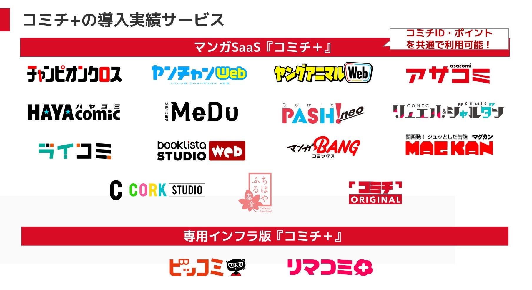 また、「コミチ+」の導入により、先行して導入している「チャンピオンクロス(秋田書店)」「ヤングアニマルWeb(白泉社)」「ライコミ(マイクロマガジン社)」「ハヤコミ(早川書房)」をはじめとする14のメディアと共通のIDが使用可能になります。この仕組みが、新作の認知拡大に寄与することが期待されています。