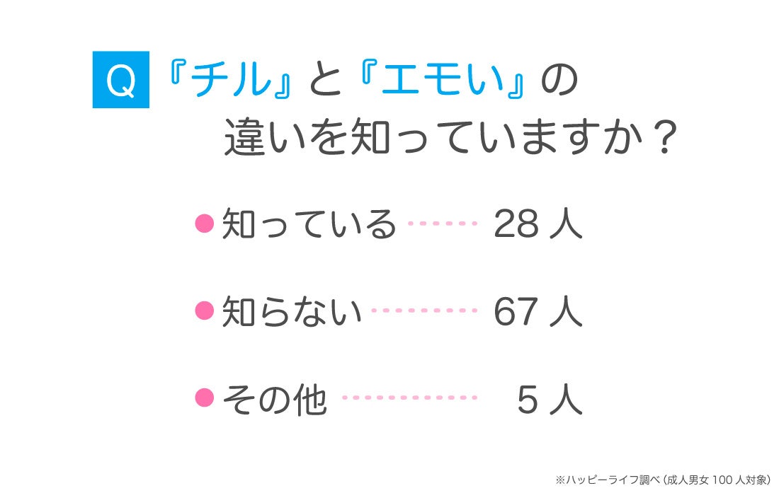 『チルい』と『エモい』の違いを知っているか聞いてみたところ、知っている人と答えた人が28人でした。
