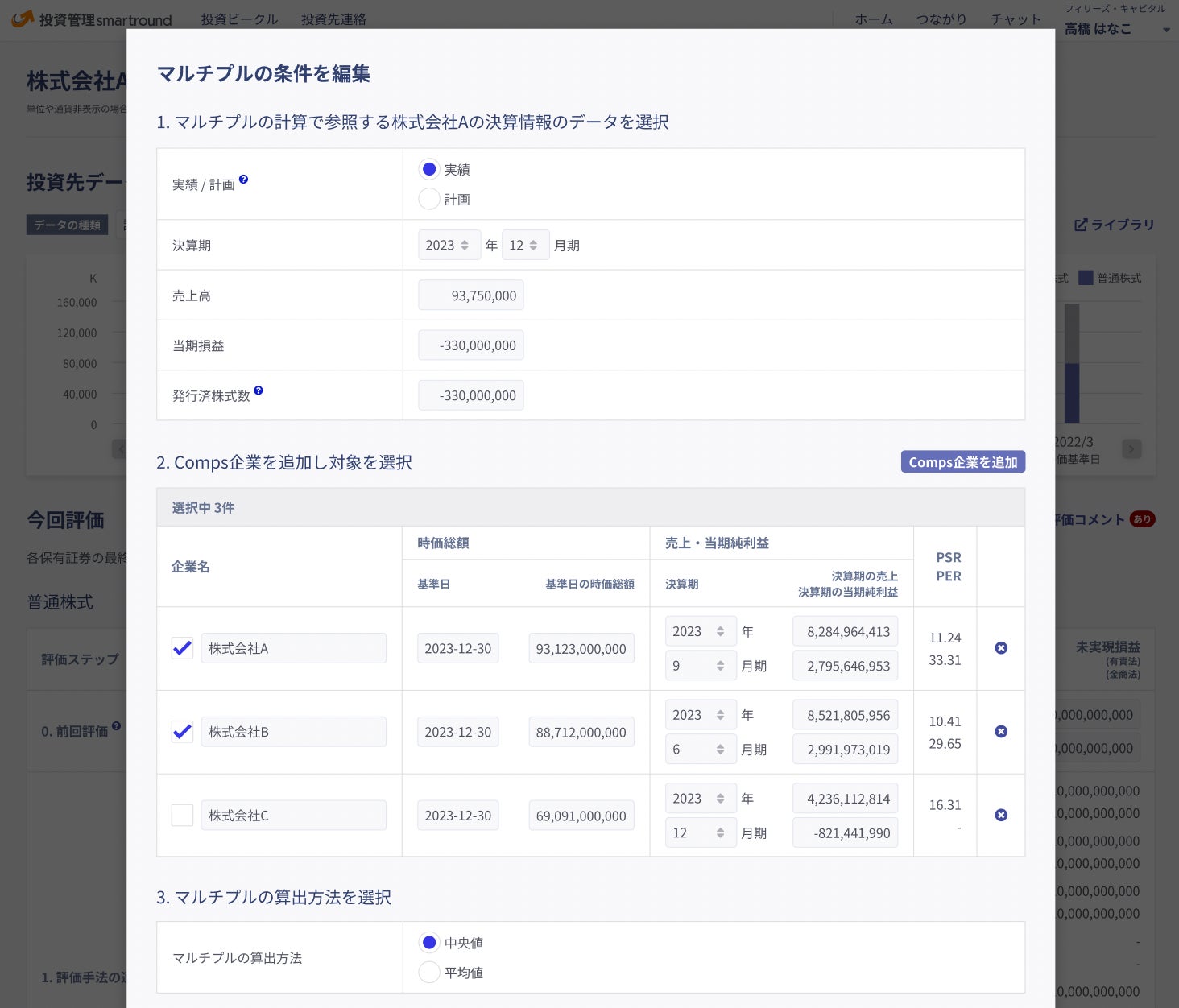 類似会社(Comps企業)の時価総額や財務データを管理し、PSRなどの倍率指標を算出できます。smartroundに格納されている投資先の財務データを参照し、投資先の企業価値および保有証券の評価額を自動計算します。
