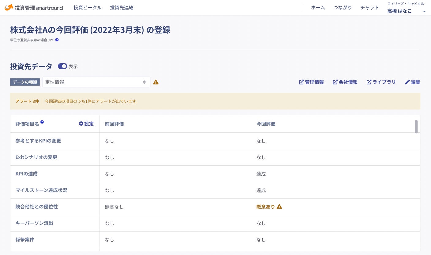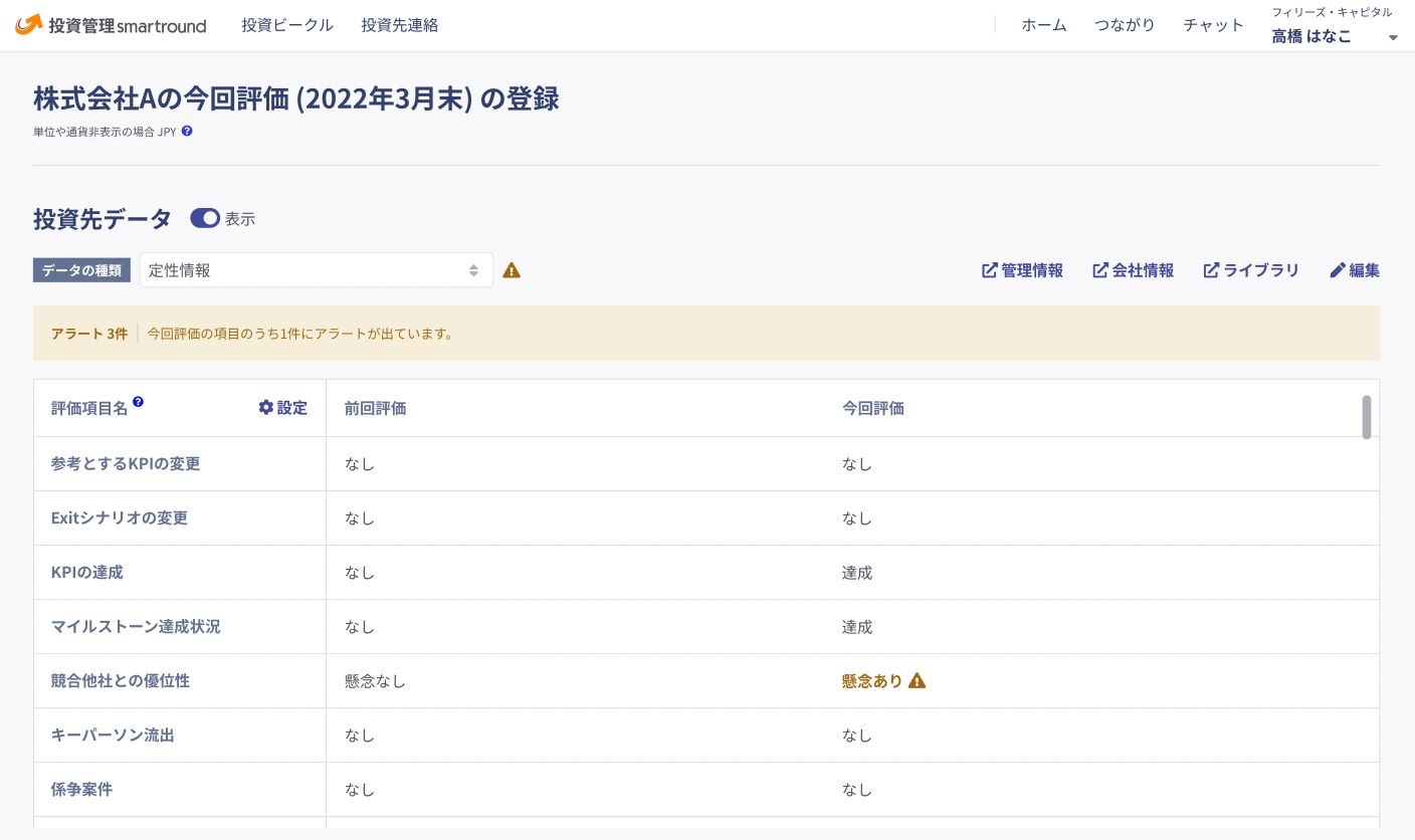 「KPIやマイルストーンの達成状況」といった定性的な評価項目についても、ファンドごとに個別に項目をカスタマイズして設定でき、各評価のタイミングで入力し、評価に注意を要する場合はアラートを表示することもできます。