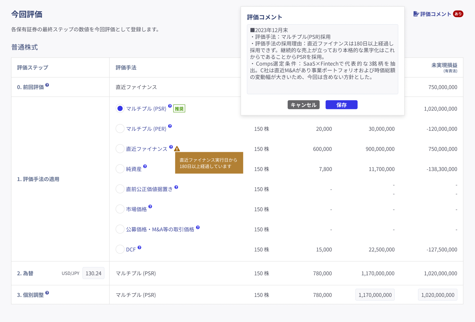 直近ファイナンスやマルチプル、純資産といった主要な評価手法につき、評価額などを自動計算したうえで横並びで比較し、投資先に最適な評価手法を選択できます。直近ファイナンスからの経過日数や財務情報の状態をもとに評価手法を推奨したり、アラートを表示して評価手法の選択に活かせます。