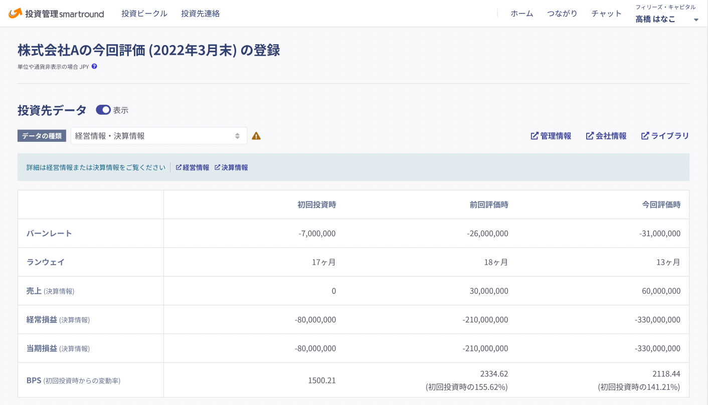 投資先のランウェイや財務情報、ファンドの持分比率やこれまでの評価額の推移など、評価の判断において重要な投資先のデータを一目で把握できます。