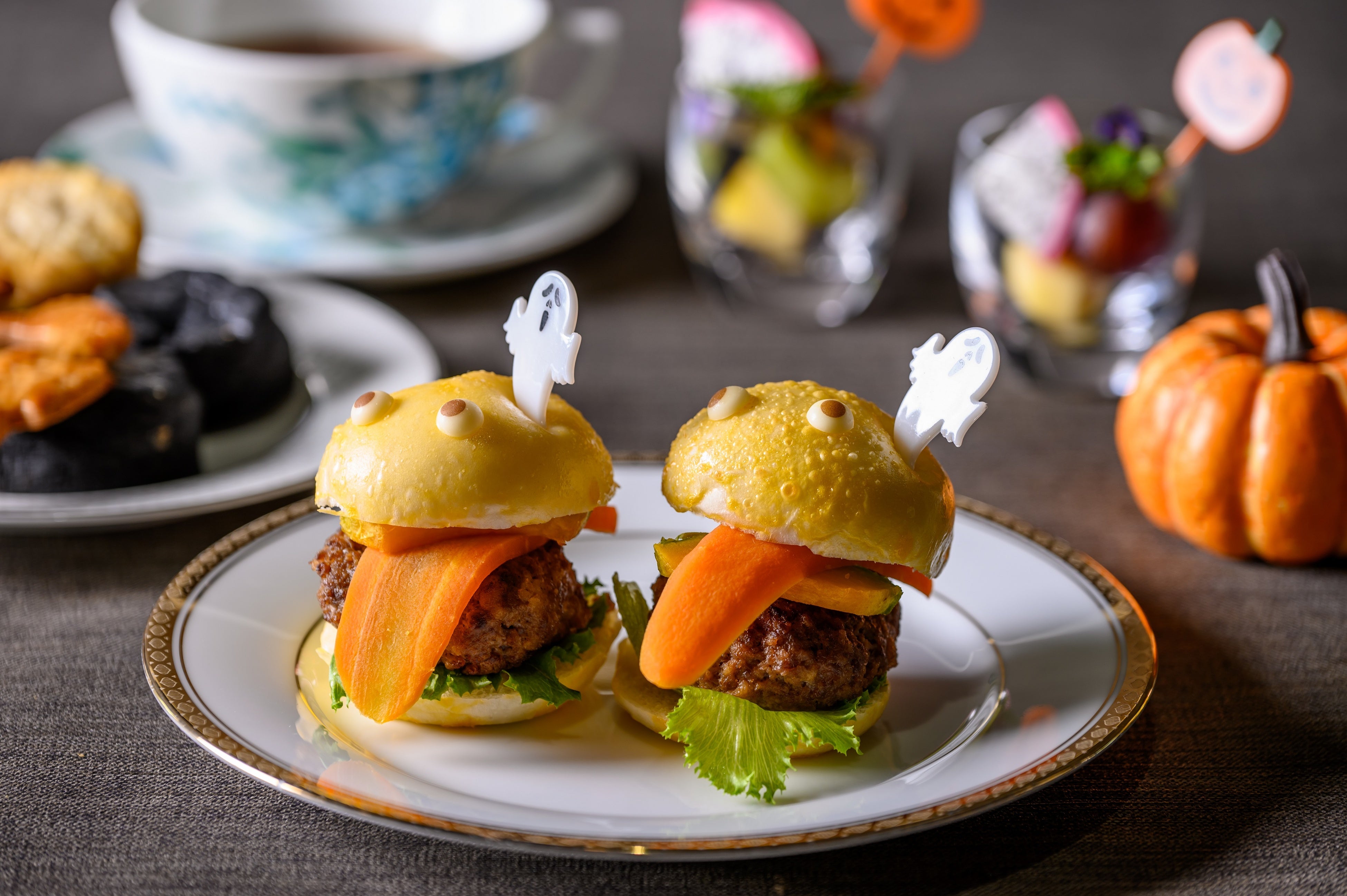 スタンドで提供するアフタヌーンティーは、コウモリをあしらったかぼちゃのパウンドケーキや、かぼちゃのピックをさしたフルーツをはじめ、中段には、お化けを模った砂糖菓子を添えた紫芋のオープンマカロンや、定番のチーズケーキなどのスイーツをご用意。下段のセイボリーでは、三重県産 美熊野牛を使用し、ベロを出したお化けをイメージさせたバーガーに仕上げ、またアフタヌーンティー定番のスコーンは、プレーンのほかに黒い竹炭を使用し、ハロウィンを演出しています。