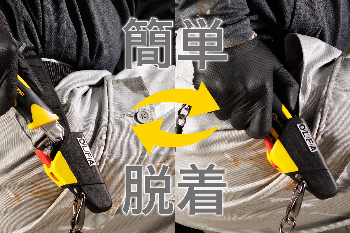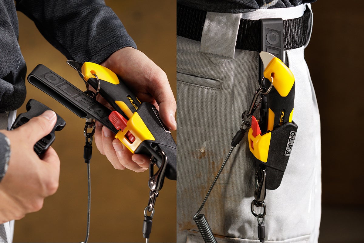 ハイパー専用クイックホルダー」は、Xデザイン・ハイパーシリーズの大型刃(刃幅18mm)専用設計のカッターホルダーです。ホルダーにカッターナイフを差し込むだけでしっかりロックでき、使う時はカッターナイフを握るような自然な動作でロック解除できます。ベルトループは前後30°ずつ角度を変えることできるので、ユーザーそれぞれの脱着しやすい角度に調整できます。