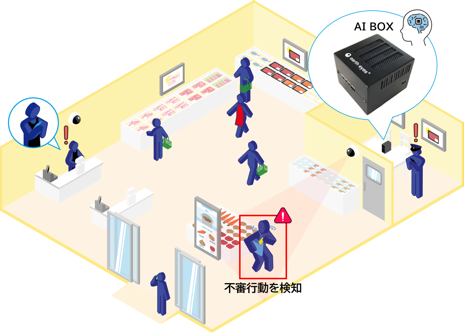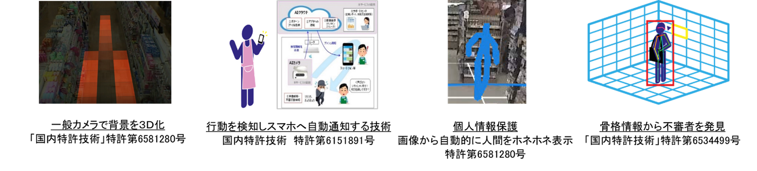 (1)不審行動検知(万引き) (2)AI画像検知エンジン ・顔認証 ・色検知(服の色などを判別) ・自動車ナンバー検知 |