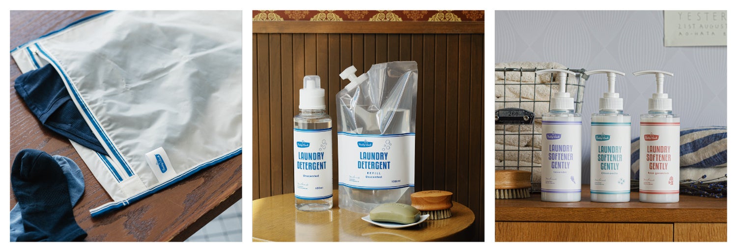 フレディ レックでは、海洋マイクロプラスチックの原因となる衣類の繊維くずを減らす洗濯ネット、オリジナルで開発している肌と海にやさしい洗濯洗剤や、肌と海にやさしく吸水性を保つ柔軟剤など、ファインデザイン・ファインクオリティを大切にしつつ、環境に配慮した製品をつくっています。
