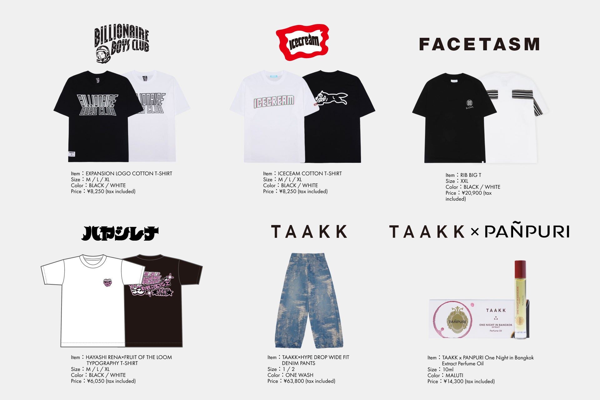 人気のExpansionロゴを全面にプリントしたBILLIONAIRE BOYS CLUBのロゴTシャツ、FACETASMからはブランドを象徴するロゴをあしらったTシャツに加え、New collectionからデザイナー落合宏理氏自らが厳選したグラフィックをスペシャルカラーにて仕上げたExclusiveをリリース。その他、新進気鋭のアーティストのハヤシレナ氏や、パリコレに進出し活躍するTAAKKなど、HYPE DROPでしか手に入らない貴重なアイテムをリリースいたします。