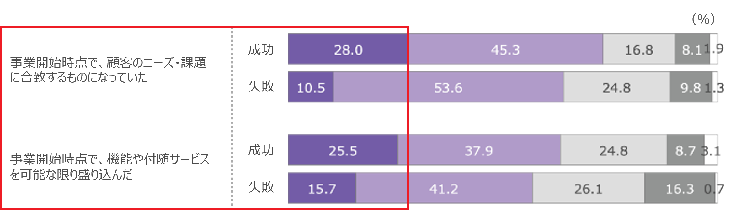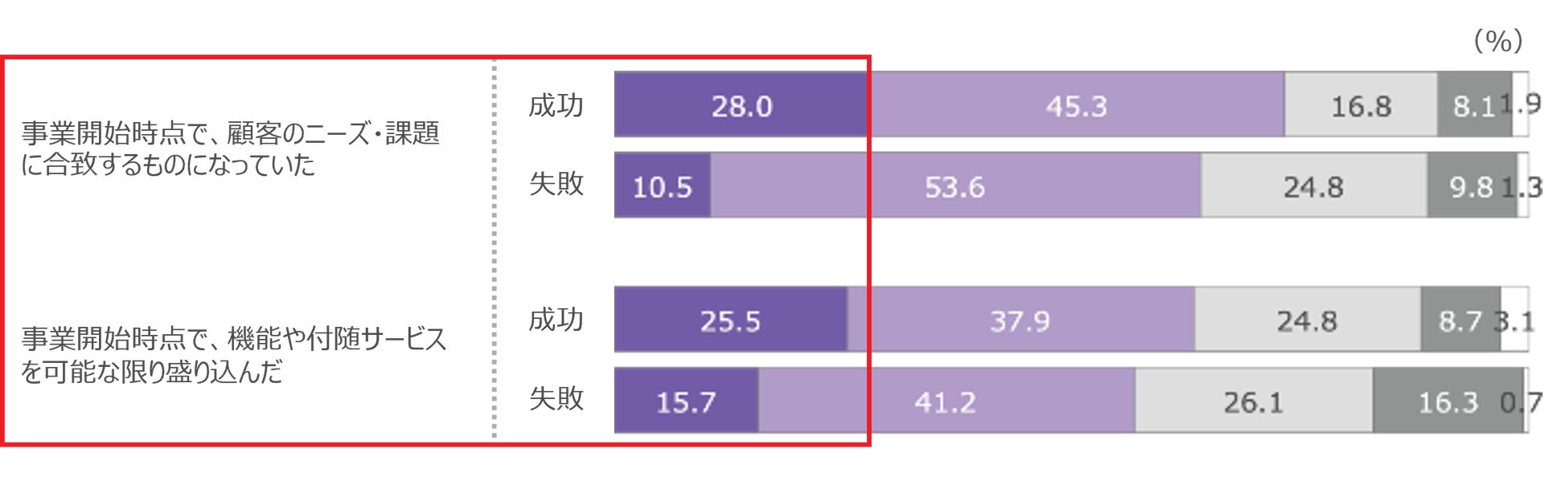 商品・サービスについて事業開始時点では、失敗層は「顧客のニーズ・課題に合致するものになっていた」「機能や付随サービスを可能な限り盛り込んだ」と回答した割合が低い。顧客が誰で、どのような商品・サービスがフィットするかの見極めが甘いままリリースに至ると、事業の失敗につながると言える。