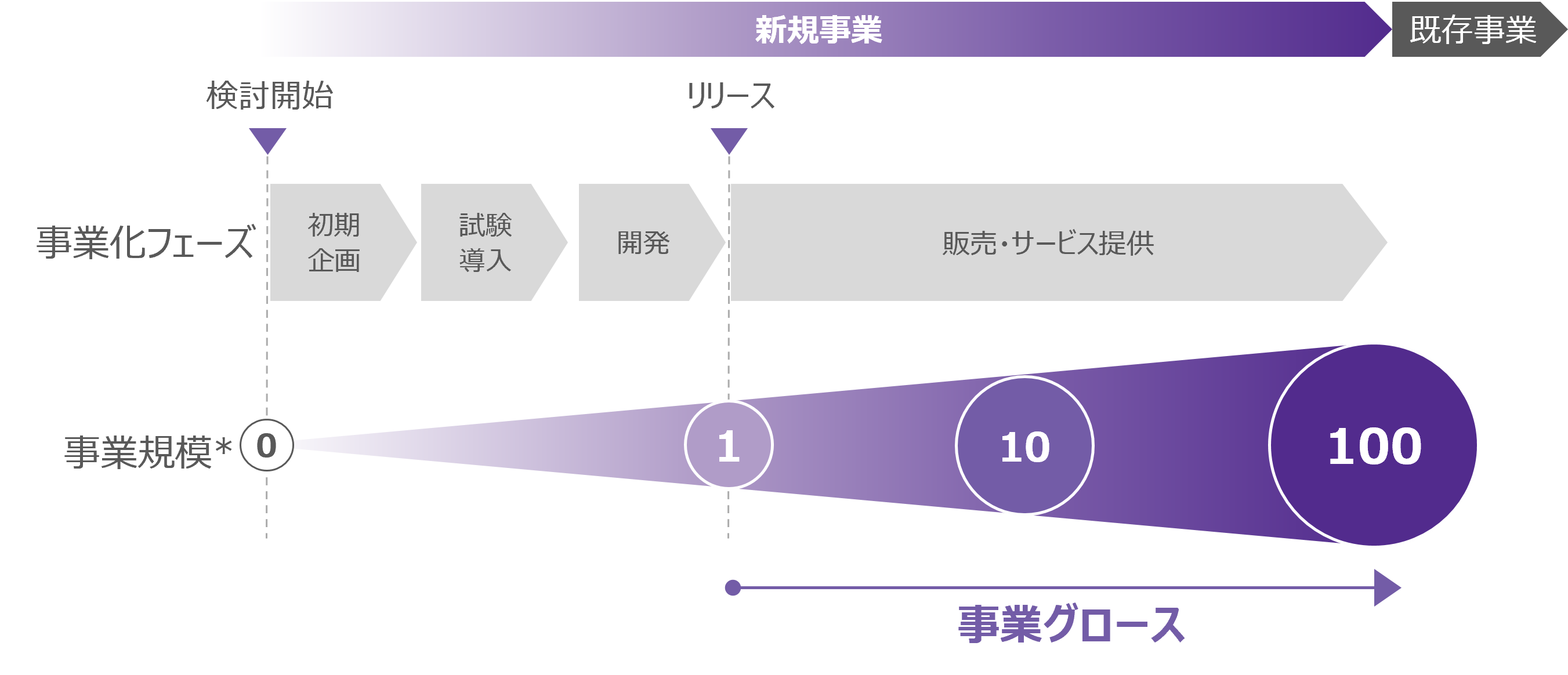 本調査における事業グロースは、「新規事業をリリースした後の事業拡大・成長に向けた取り組み」を指しています。一般的に新規事業として注目される、検討開始からリリースまでの“ゼロイチ”のフェーズではなく、その後の1→10、10→100等の拡大フェーズにおける取り組みを対象としています。(下図参照)