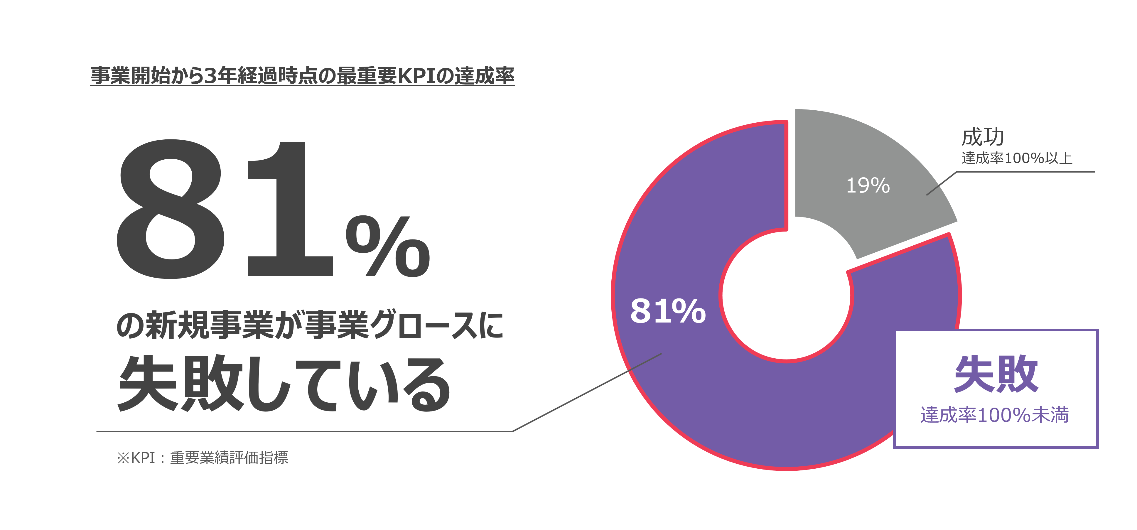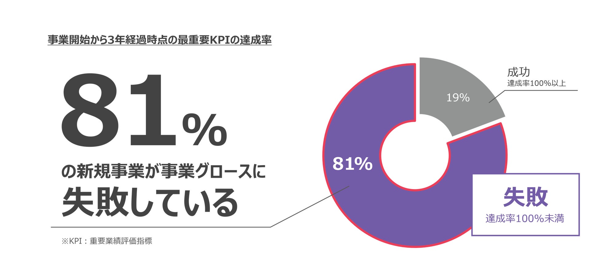 本調査の対象者が回答した事業において、事業開始から3年経過時点での最重要KPIの達成度が100%以上を“成功”、100%以下を“失敗”と定義して調査したところ、81%の新規事業が事業グロースに失敗していることが分かった。なお、最重要KPIとして設定される項目の上位は「売上」「利益」「販売数・契約数」だった。