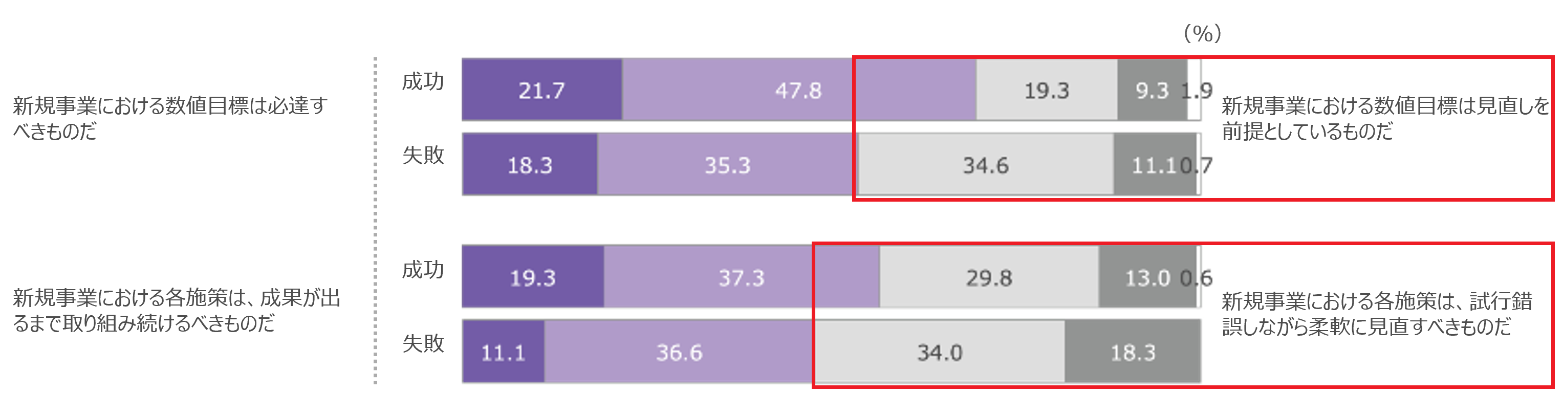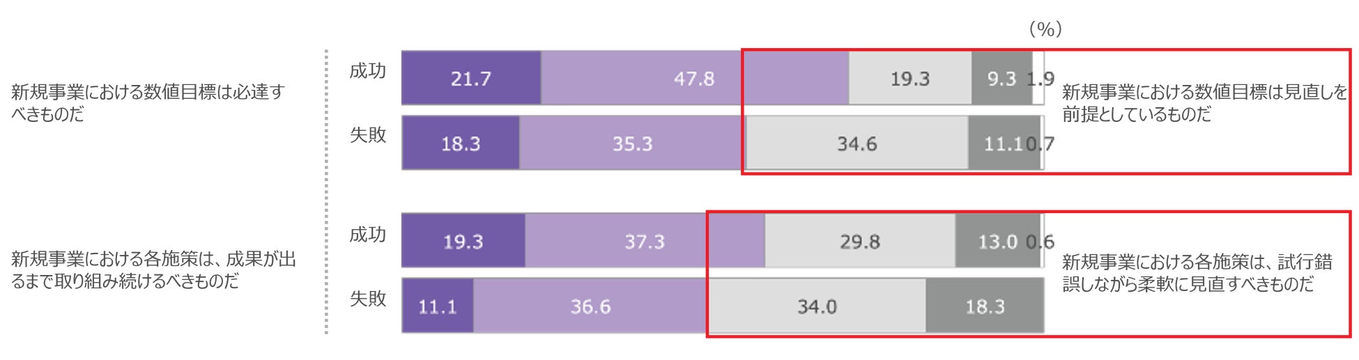 失敗層は、「新規事業における数値目標は見直しを前提としているものだ」と回答した割合が10pt以上高く、また「新規事業における各施策は、試行錯誤しながら柔軟に見直すべきものだ」と回答した割合も高い。