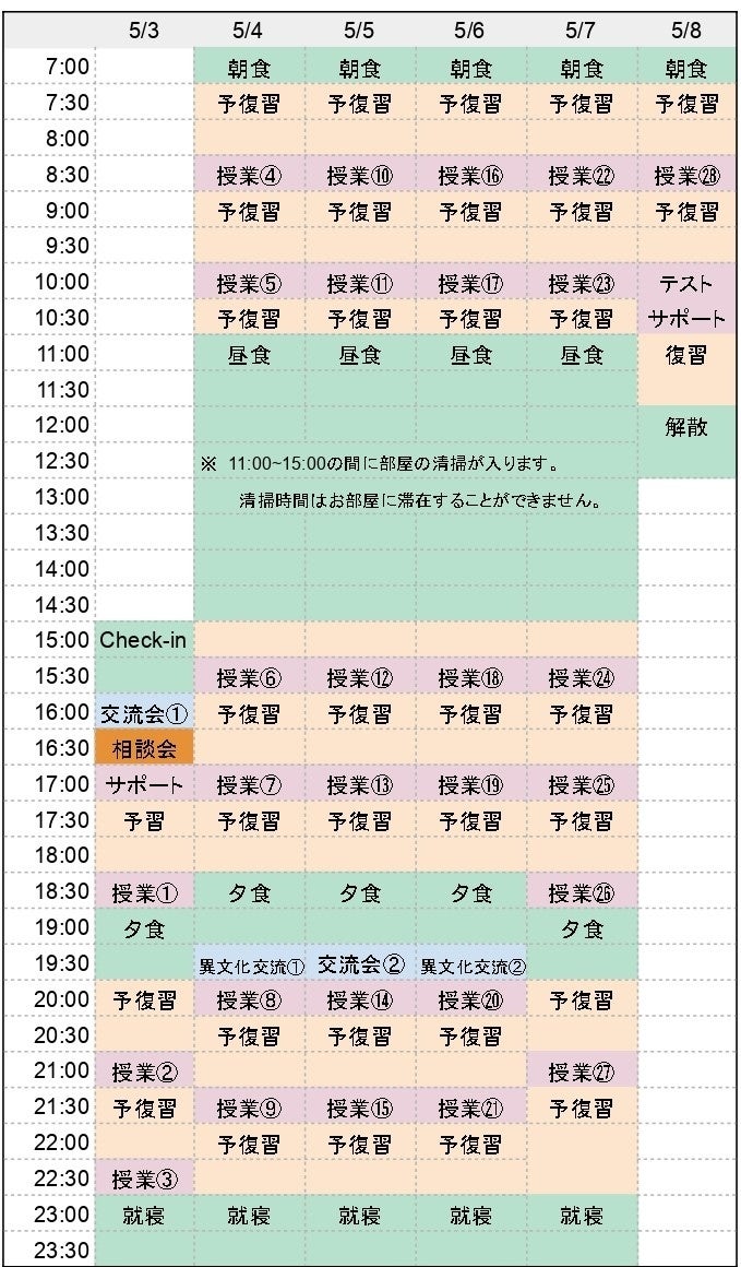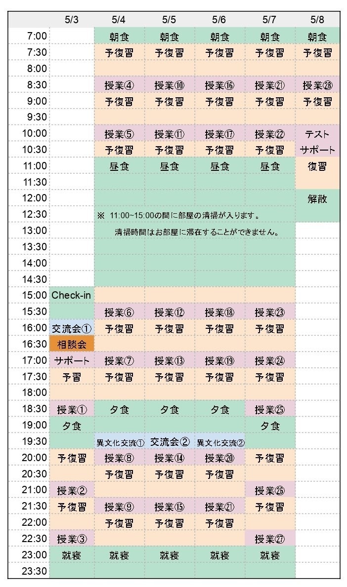 ※スケジュール表はトレーナーの稼働や状況に合わせて若干ずれる可能性があります。
