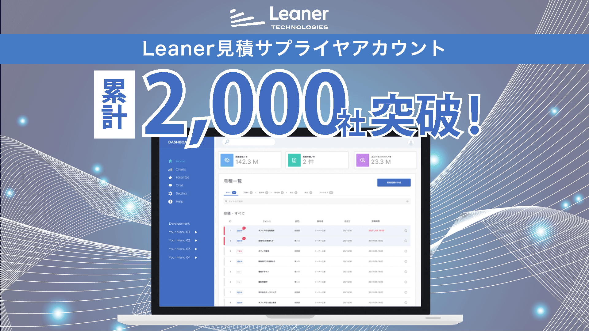 Leaner Technologiesは、アナログな見積業務をデジタル化するプラットフォーム「Leaner見積」の提供により、製造業を中心とした企業の調達力強化をサポートしてまいりました。この度、Leaner見積を導入するバイヤー企業が見積依頼先であるサプライヤー企業に発行する「Leaner見積サプライヤアカウント」の発行数が2,000社を突破いたしました。