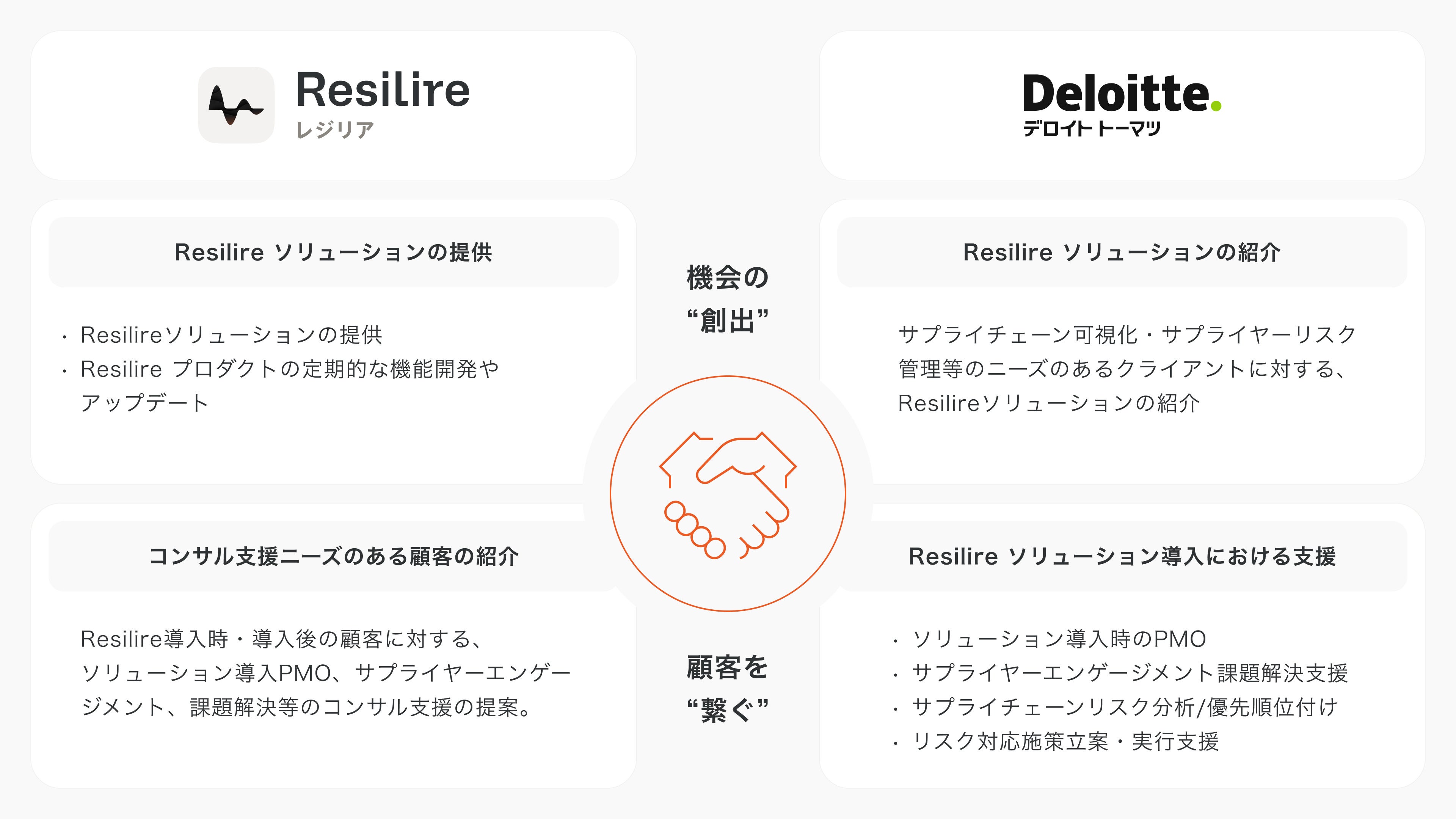 サプライチェーンの可視化とリスク検知に対する管理サービス「Resilire」を持つレジリアと、クライアントが抱える課題の対応優先付けや、課題解決のための施策立案・実行支援、サプライヤーエンゲージメントの支援に強みを持つデロイト トーマツが協力し、企業のサプライチェーンの強靭化に貢献すべく協業にいたりました。