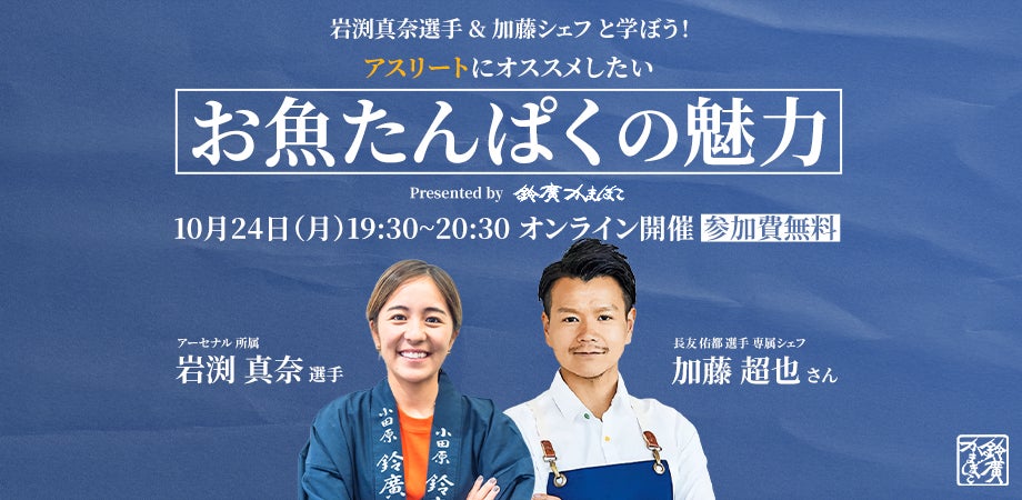 鈴廣かまぼこ大使就任に際して、岩渕選手と長友佑都選手の専属シェフ加藤超也さんをゲストに迎え、オンラインイベントを開催します!アスリートと食をテーマに、お魚たんぱくの魅力についてお届けします。参加方法は以下のURLよりお申し込みください。沢山のご参加をお待ちしております。