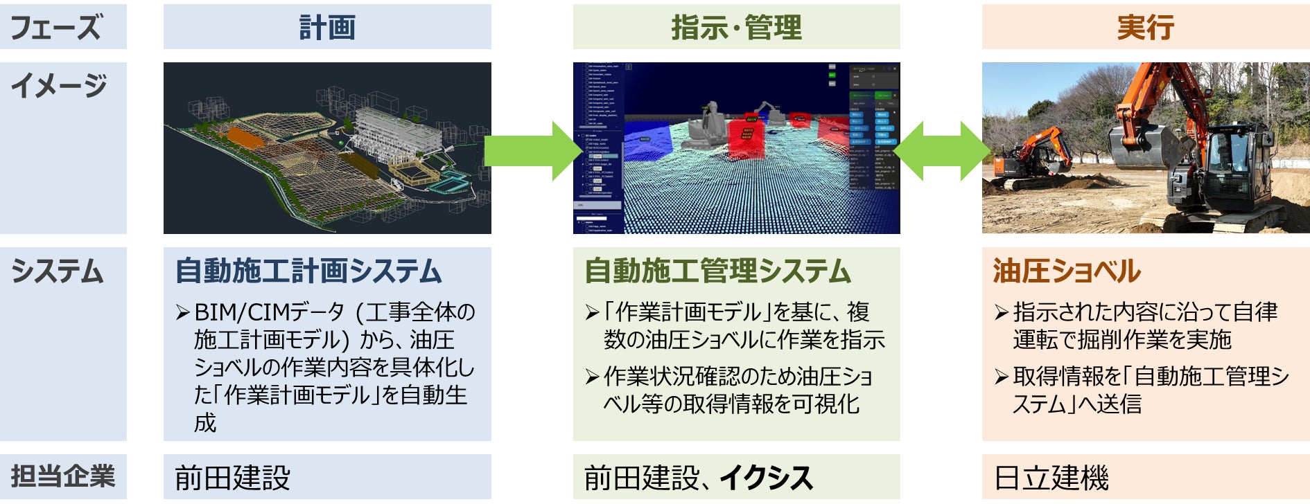 本システムは、BIM/CIM において施工計画モデルから詳細な作業計画モデルを自動生成し、その計画に基づいて複数台の油圧ショベルを自律制御可能なシステムです。近年、建設業界では、少子高齢化や技能労働者不足といった問題に対応するため、安全性と生産性の向上が求められています。現在開発が進められている遠隔操作技術などにより構成される無人化施工技術は、安全性は期待できるものの、生産性向上への寄与は限定的です。そのため前田建設と日立建機、イクシスは、1人のオペレータで複数台の油圧ショベルを操作可能な本システムの実証試験を行いました。