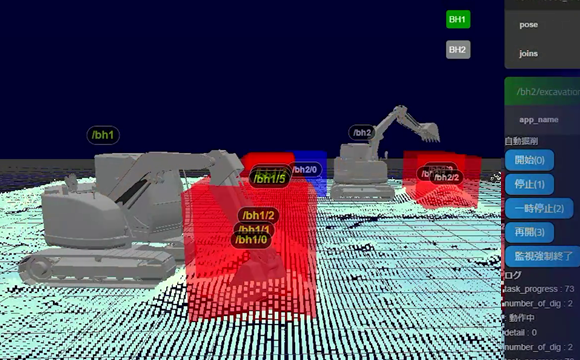 イクシスは、前田建設と共同で自動施工管理システムを開発するにあたり、自社開発した3次元ビューワー「iXs MetaViewer™」を活用することで短期間での開発を実現しました。自動施工管理システムは、施工計画を工程の進捗に応じて段階的に油圧ショベルに提供する一方、複数の3次元LiDARで計測された施工範囲の掘削状況や油圧ショベルの状態を、一元的にかつリアルタイムに可視化しますので、遠隔よりオペレータが監視・操縦することを可能にします。