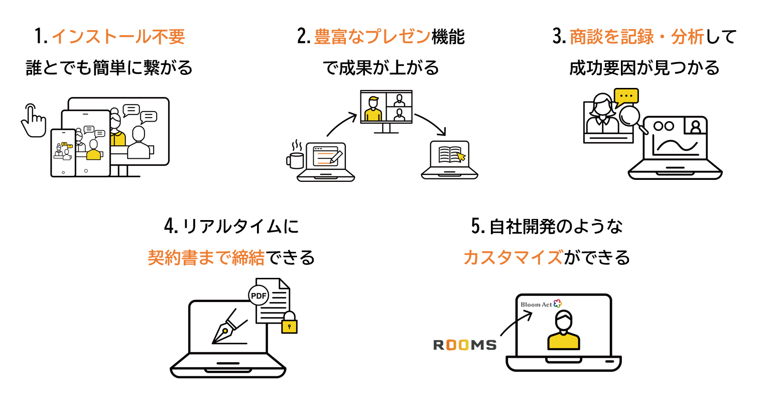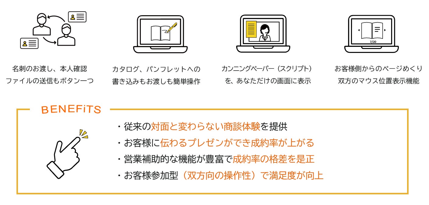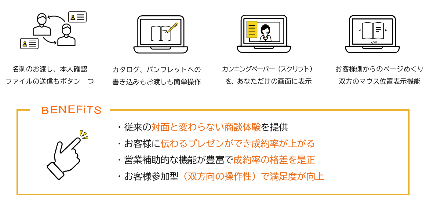 4拠点同時接続/名刺お渡し/デスクトップ共有/プレゼンモード/トークスクリプト/資料の受け渡し/ステルスメモ/音声自動議事録/チャット/ファイル送信/自動リマインドメール/Outlook・Googleカレンダー連携/背景ボカシ/商談履歴/HPとのカレンダー連携/お客様からの予約受付/担当アサイン/自社ロゴへの差し替え/録音録画/アンケート/スマホ・タブレット対応/ルームキー接続/Salesforce連携/アクセス解析タグ(Googleアナリティクス、Googleタグマネージャ)設定機能/ダイレクトコール(即時接続)機能/表情・発話分析機能/WebRTC技術(アプリなしのブラウザ通信)での10拠点同時接続機能/リアルタイム電子契約機能、など