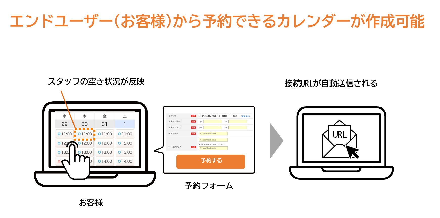 スタッフの空き状況をカレンダーに公開し、お客様側から予約ができる機能も標準装備。日程調整のやり取りが省けるだけでなく、接続URLの自動送信や担当スタッフの自動アサイン機能もついています。