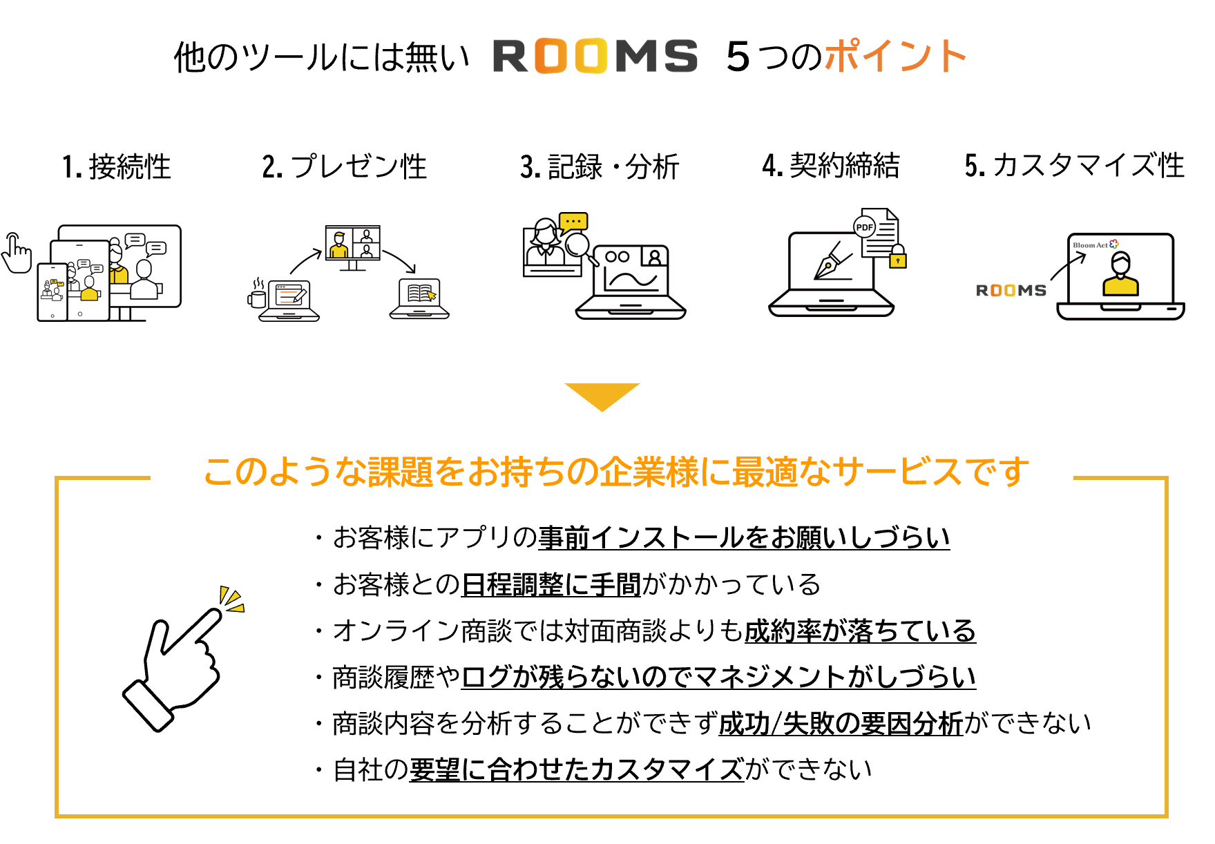 「ROOMS」にはBtoCのオンライン商談に特化した機能が豊富に搭載されており、専用アプリのインストール不要でお客様と接続でき、日程調整もカレンダー予約機能で簡略化。電子契約システム機能によりオンライン商談中に契約締結も可能。