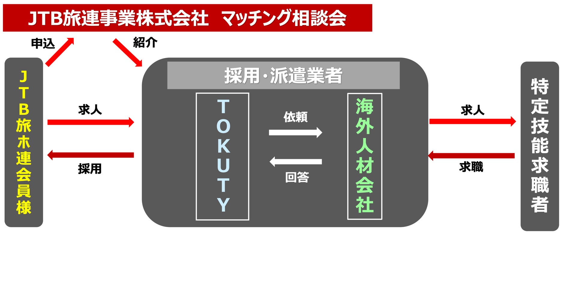 外国人特定技能人材のマッチングプラットフォームサービスの「tokuty (https://tokuty.jp/)」を提供するトクティー株式会社(本社:東京都港区、代表取締役:杉原尚輔、以下、トクティー)は、JTB旅連事業株式会社(本社:東京都文京区、代表:大西 雅之、以下、JTB旅連事業)と業務提携契約を締結しました。本業務提携契約に基づき、両者は、JTB協定旅館ホテル連盟会員(以下、JTB旅ホ連会員)に対し、特定技能人材を中心に外国人材を送客することに対し協業することが決定しました。