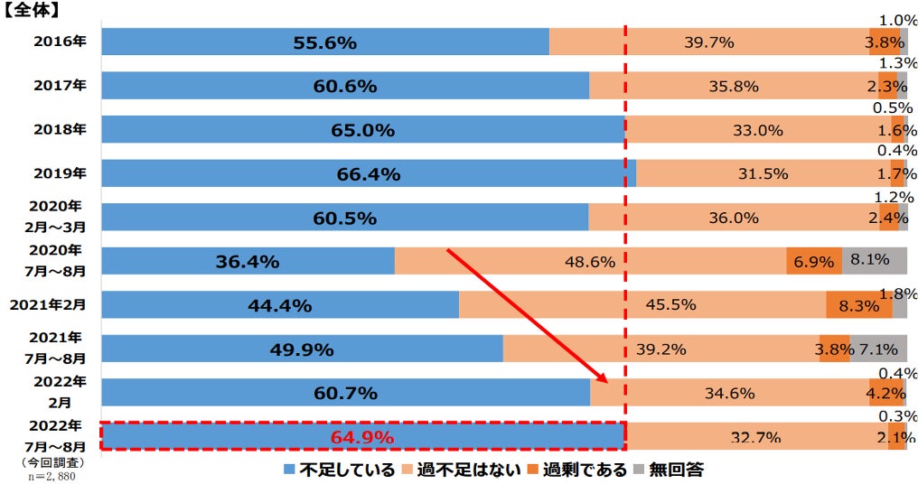 コロナウイルスにより、宿泊需要の枯渇と共に、宿泊業界に関わっていた人材も他業種へ転職し、現在採用しようとしても、多くの施設が採用できていない現状があります。日本・東京商工会議所実施の「人手不足の状況および新卒採用・インターンシップの実施状況に関する調査 URL: https://www.tokyo-cci.or.jp/page.jsp?id=1031915 (以下、同調査)」によれば、2022年7-8月時点で、全業種会員の64.9%が人手不足と回答しています(図1)。
