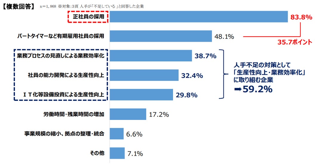 また、人手が「不足している」と回答した企業の対応方法は、「正社員の採用」と回答した企業の割合が83.8%となっています(図2)。