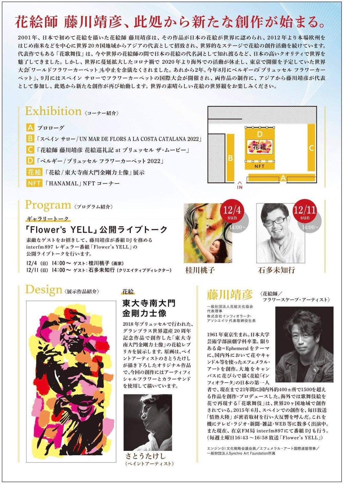 また会場には、藤川が 2018 年にブリュッセルで創作した、グランプラス世界遺産 20 周年記念作品「東大寺南大門金剛力士像」の花絵も展示します。 さらに期間中はゲストを招いてのギャラリートークも開催、展覧会を通じて、多くの方々に花絵の魅力を伝えていきます。