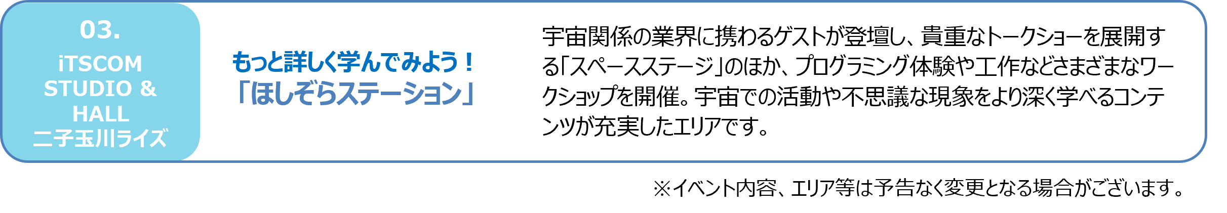 二子玉川ライズ ガレリアを舞台とした「ボーディングステーション」&「うちゅうステーション」、ならびにiTSCOM STUDIO & HALL 二子玉川ライズを舞台とした「ほしぞらステーション」という3つのエリアで構成されており、順番に巡っていくことで、楽しみながら宇宙にまつわるさまざまな知識を得ることができます。