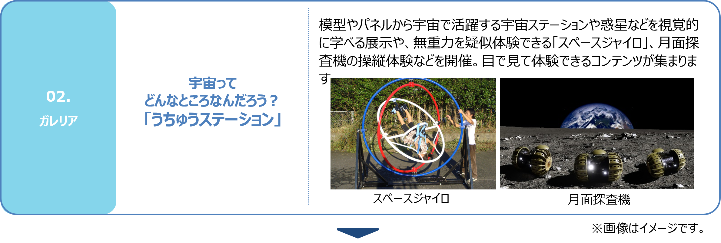 宇宙への旅の出発地点「ボーディングステーション」からゲートをくぐると辿り着くのは「うちゅうステーション」。国際宇宙ステーションや惑星などの模型とパネルをはじめとした展示を通じ、宇宙への理解を深めます。また、同会場内では無重力を体感できる「スペースジャイロ」や月面探査機の操縦コーナーなどのコンテンツを体験することもできます。さらに「ほしぞらステーション」では、宇宙業界に携わるゲストによるトークショーをはじめ、ワークショップも開催。宇宙にさらに深く興味を持つきっかけになるような、発見と学びが詰まったコンテンツを展開します。