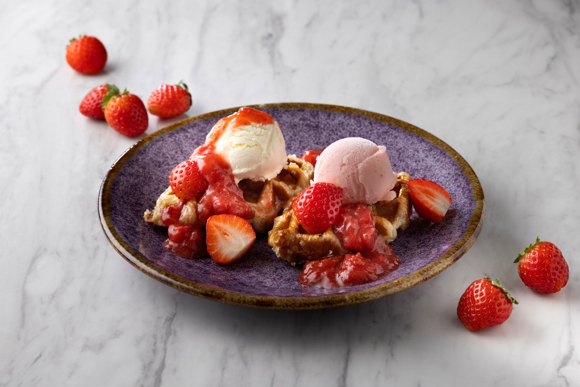クロッフルプレート(gelato & strawberry) 焼き立てクロッフル、バニラ&ミガキイチゴジェラート、ミガキイチゴコンポート、生いちご ※ドリンク代別途