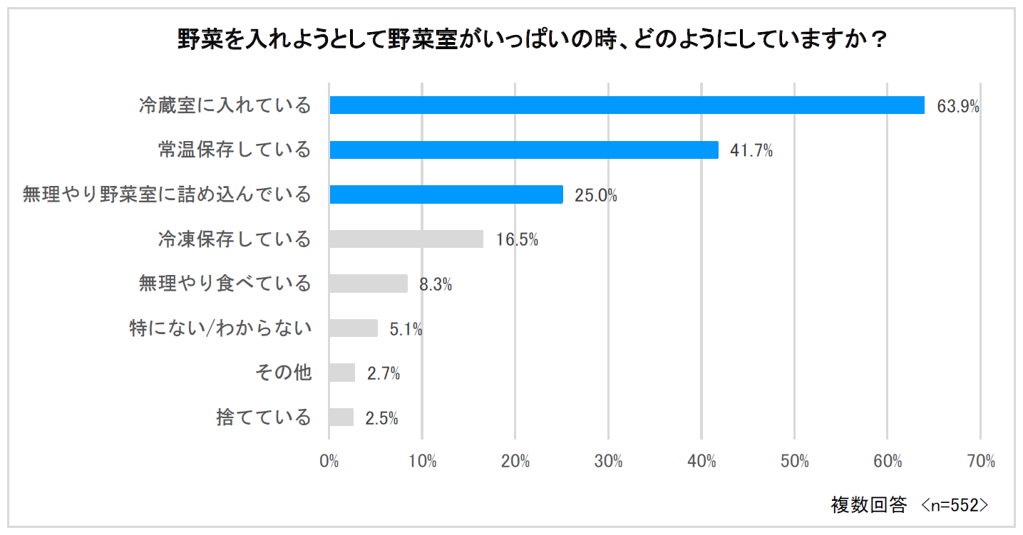 - 野菜室がいっぱいで入らない時の保存方法は、1位:冷蔵室で保存している(63.9%)、2位:常温保存している(41.7%)、3位:無理やり野菜室に詰め込んでいる(25.0%)