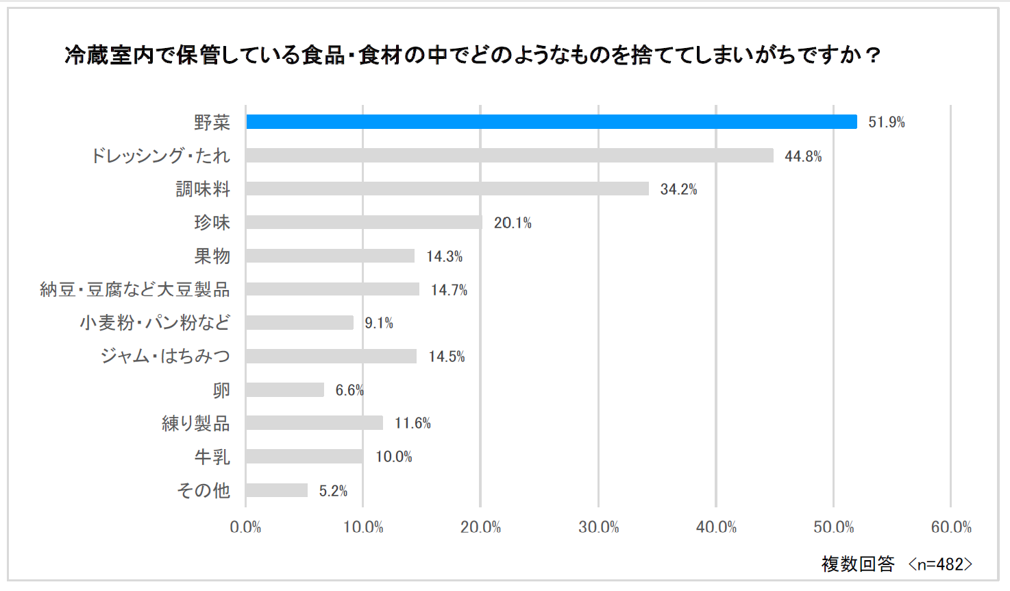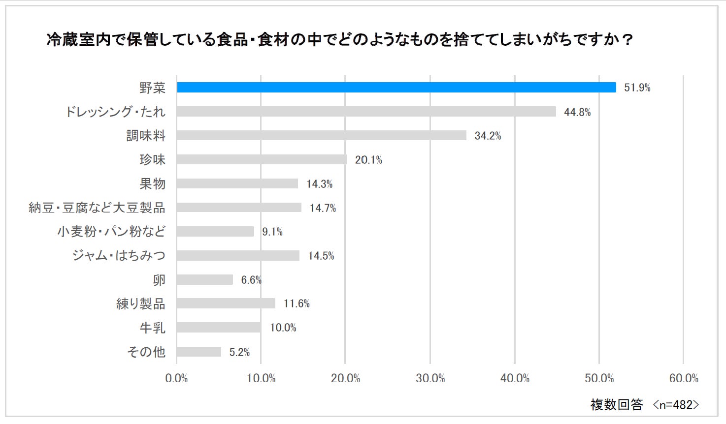 - 冷蔵庫内で保管している食品・食材のうち、廃棄されているものの1位は野菜(51.9%)、2位はドレッシング・たれ(44.8%)、3位は調味料(34.2%)。