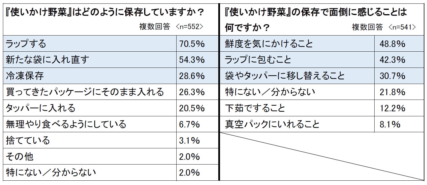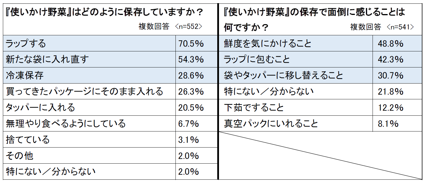 - 使いかけ野菜の保存方法で多かったのは、1位:ラップする(70.5%)、2位:新たな袋に入れ直す(54.3%)、3位:冷凍保存(28.6%)使いかけ野菜の保存で面倒に感じることは、1位:鮮度を気にかけること(48.8%)、2位:ラップに包むこと(42.3%)、3位:袋やタッパーに移し替えること(30.7%)