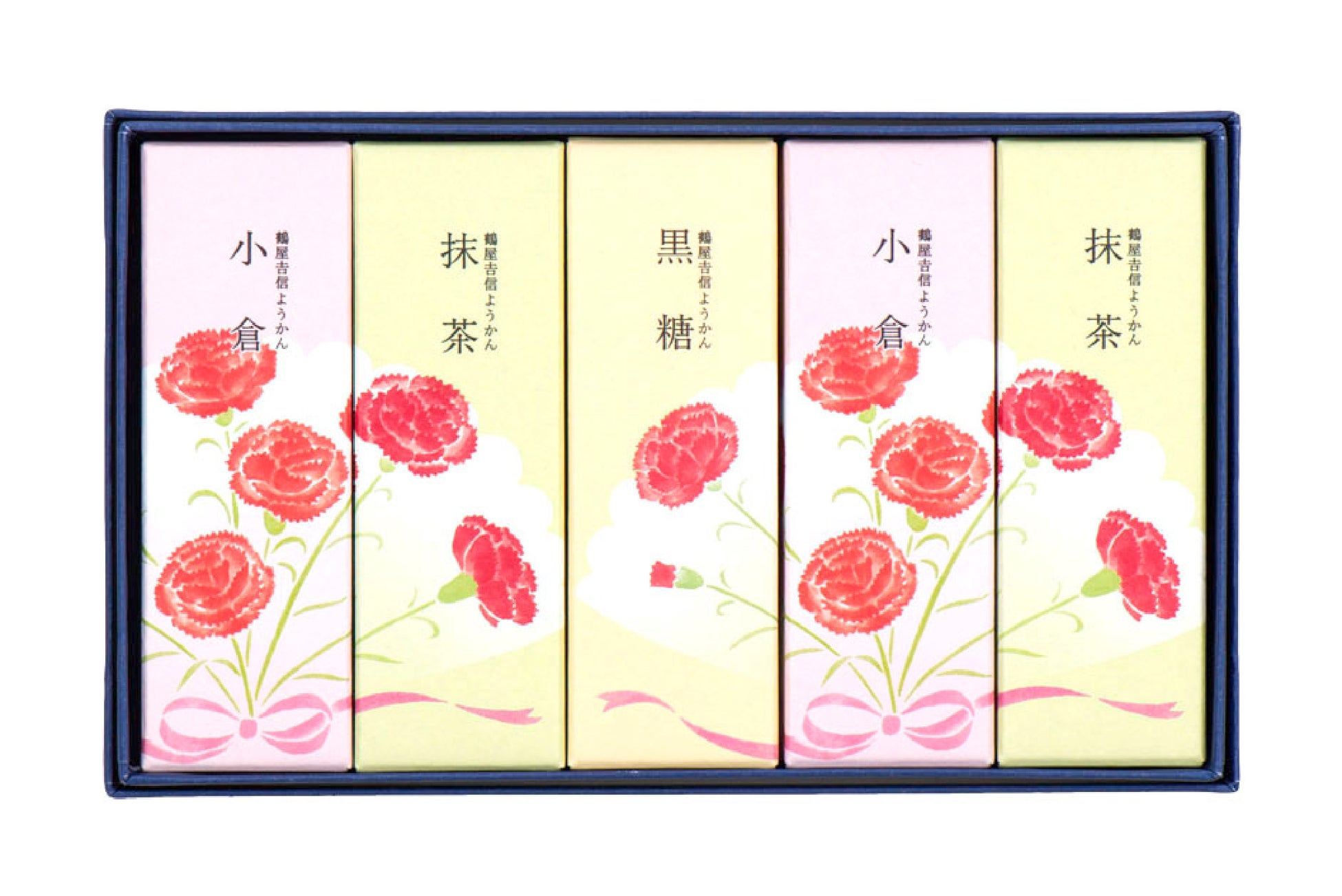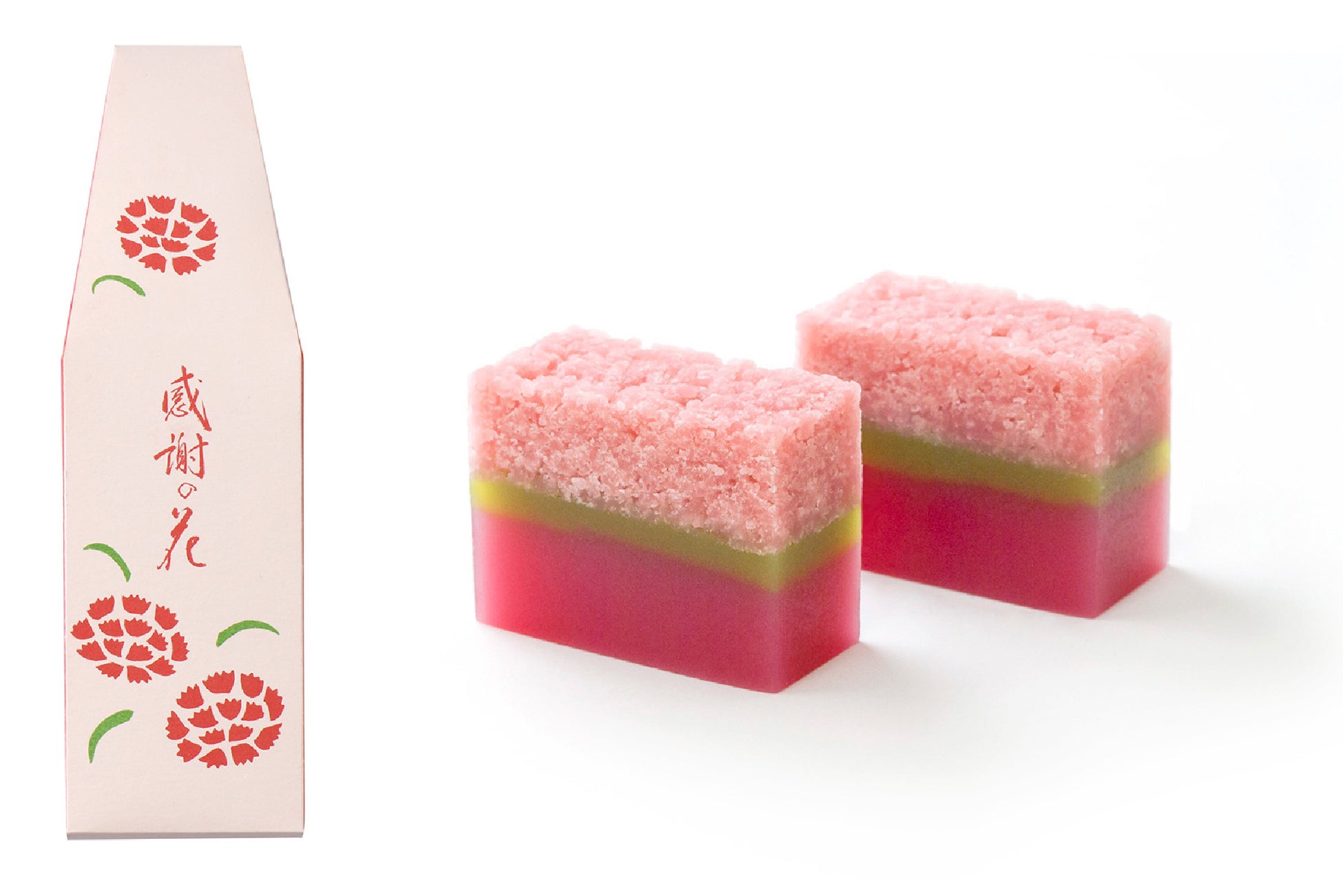 お手軽にお楽しみいただける人気のミニ羊羹3種を、カーネーションの花束の意匠をあしらった、母の日限定パッケージで包みました。