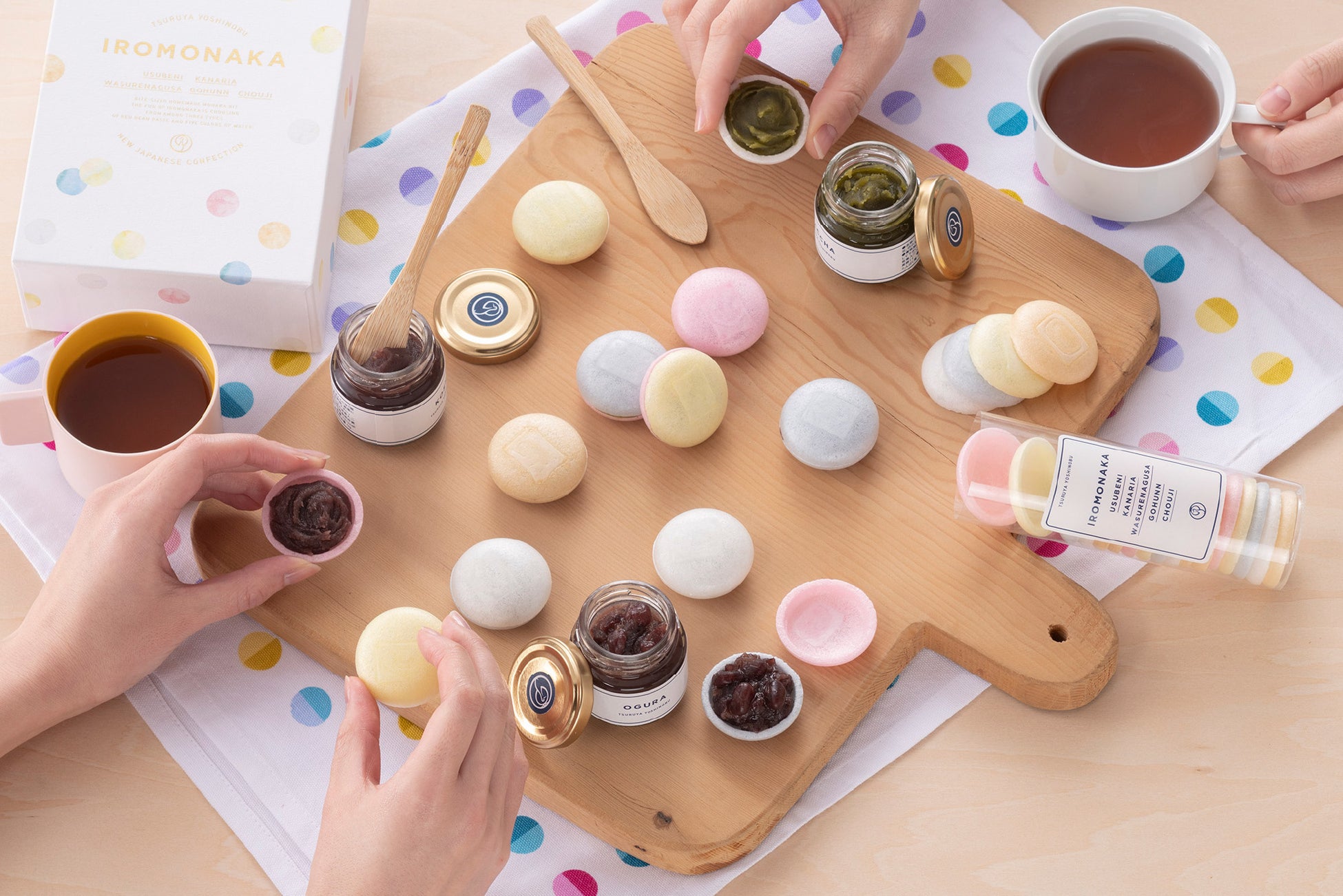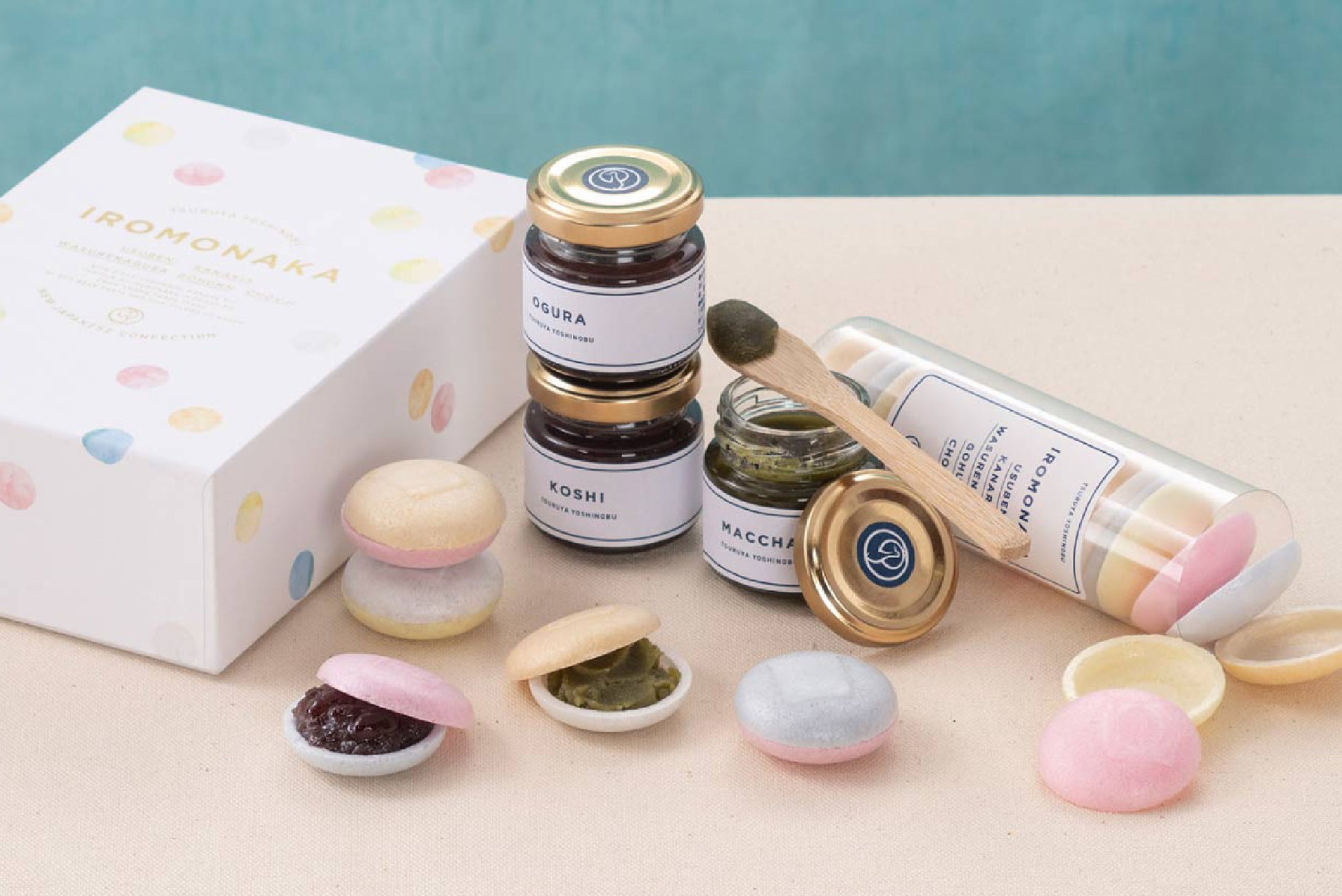 「IROMONAKA(いろもなか)」は3種のあんと5色の最中種がセットになったお詰合わせ。お取り寄せでも大人気の、WEB限定パッケージ版商品です。