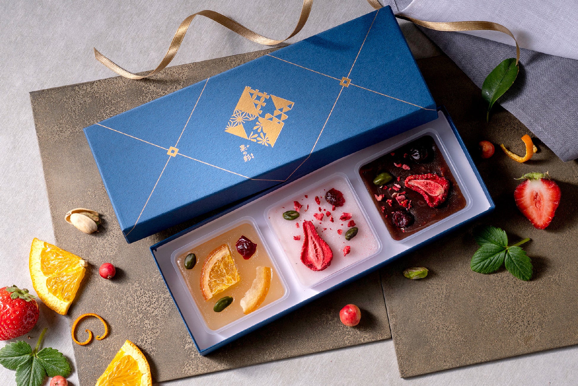 タブレットのように薄くつくったようかんと、素材の美味しさをぎゅっととじこめた色とりどりのドライフルーツやナッツをあわせた3種のあじわいをひと箱におさめた、新感覚の和菓子「果の彩」。