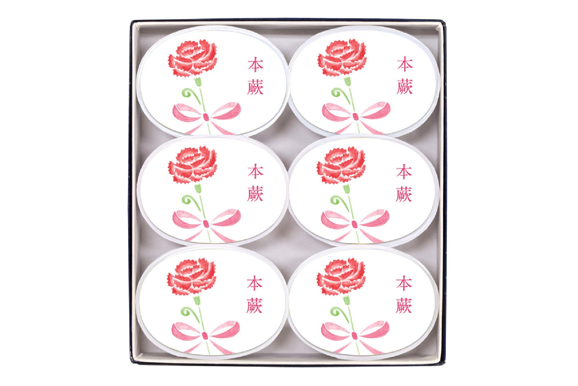 紺色箱にお詰め合わせしてカーネーションの掛紙をかけた、お花づくしの一箱です。
