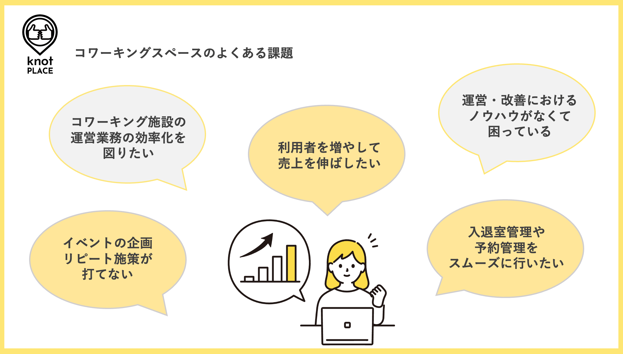 knotPLACEはまさにこうしたコワーキングスペースを自ら運営してきたからこそ得られたお客様や施設スタッフの声を元に開発してきたサービスであり、その強みを活かして随時機能のアップデートを行っていくことで、常にknotPLACEを利用することで最先端・最大効率のコワーキングスペース運営ができる、そんな世界を実現します。