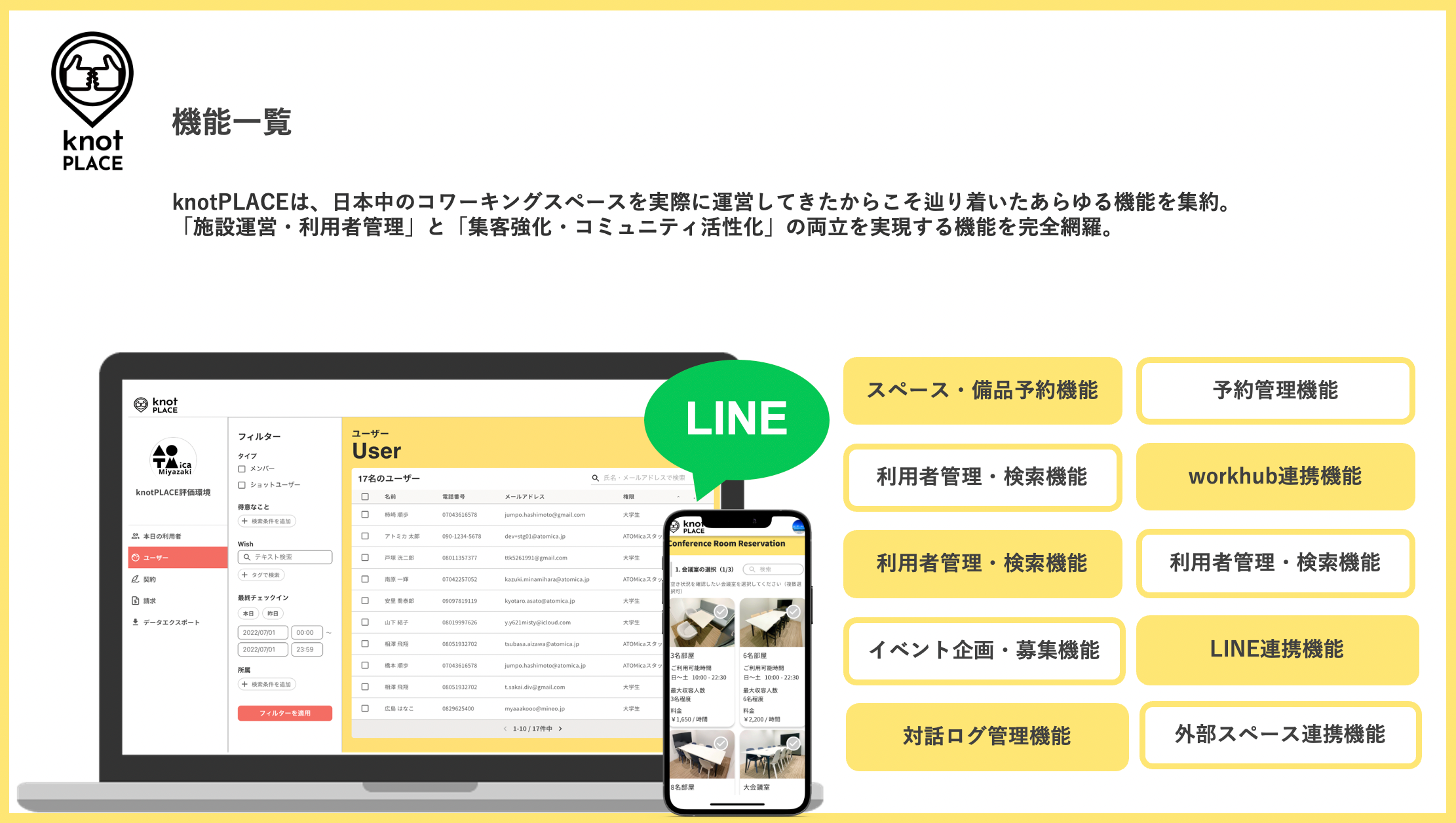 knotPLACEには施設・備品の予約管理から、スマートロックの解錠を含む入退室管理、契約プランに応じた利用料金の自動集計、請求機能など、スペースの運営に必要なありとあらゆる機能が搭載されているだけでなく、ユーザーはそれらの全てをLINE(もしくはウェブ)で利用することが可能です。日常的に利用するSNSであるLINEから予約や入退室ができることにより、利用率の向上が見込めるだけでなく、LINEを通して全てのユーザーとやり取りが行えるため、イベント参加率の飛躍的な向上を見込むことができます。
