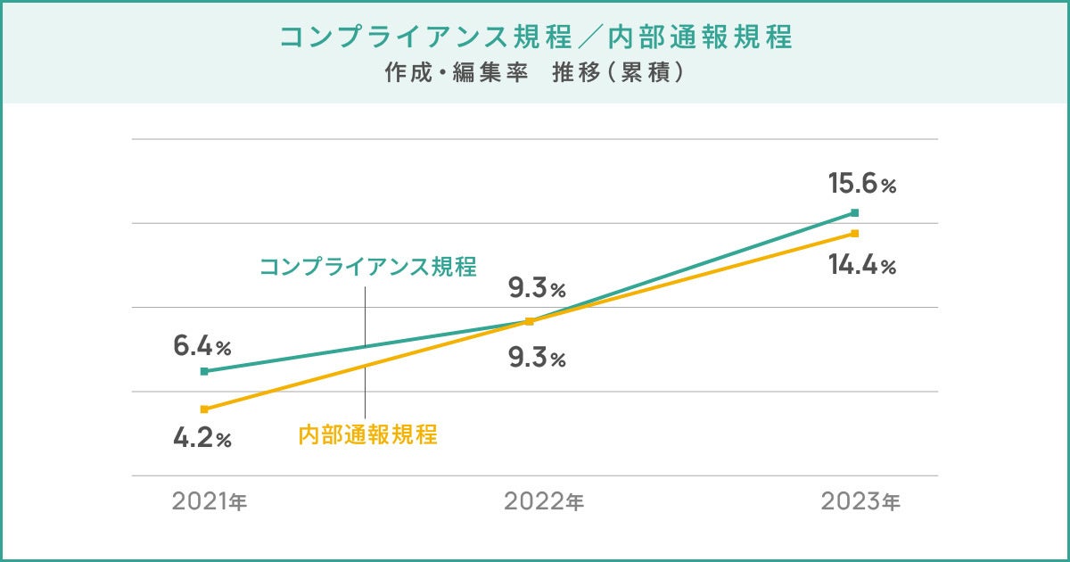 ① この1 年でコンプライアンス規程の作成・編集率は約1.7 倍増、内部通報規程は約1.5 倍増。