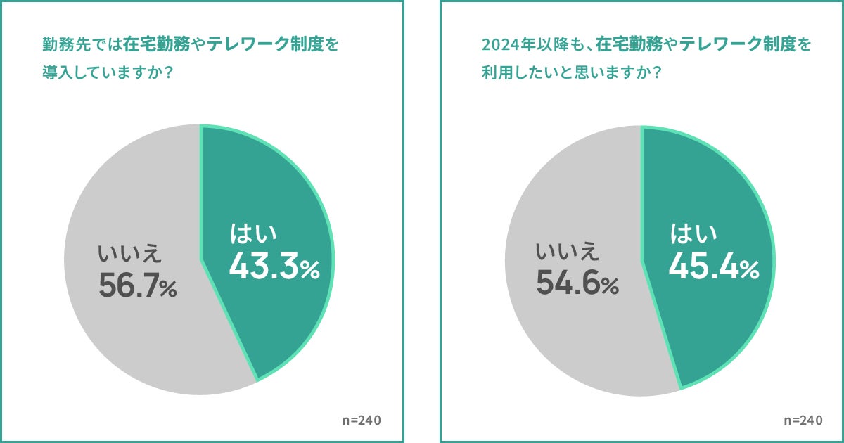 また、当社が2023年12月に全国の20~60歳の会社員に実施したアンケート調査※3では、勤務先で在宅勤務やテレワーク制度を導入していると回答した人は約4割だったことからも、オフィス回帰の動きもある中、在宅勤務やテレワークが定着している様子がうかがえる。来年2024年以降も、在宅勤務やテレワークを組み合わせたハイブリッドな働き方が浸透していくと考えられる。