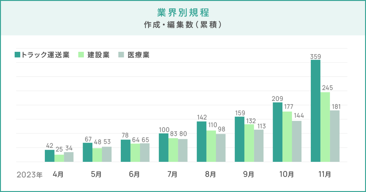 また、「2024 年問題」に関連するトラック運送業・建設業・医療業の業界別で社内規程の作成・編集数をみると、2023 年11 月時点でトラック運送業は359 だったのに対し、建設業は245、医療業は181 でした。年間の時間外労働時間(残業時間)の上限が規制される2024 年4 月に向けて、社内規程や就業規則の改定を行う必要がありますが、業界で対応に差が生じている様子が見られました。