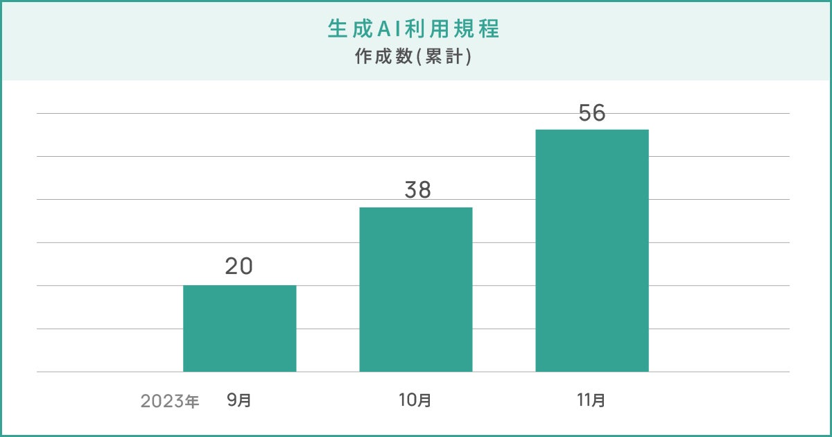 ChatGPT などの『生成AI』が普及し、企業では業務効率化が可能となる一方で著作権侵害や情報漏洩、誤情報の拡散などの新たなリスクも抱えることになる。そこで当社では、生成AIに関する社内規程を作成できる新機能を2023年9月に提供開始した。その結果、生成AI利用に関する社内規程の作成・編集数は、毎月約1.5倍ペースで増加。生成AIの活用が企業で進む中、それに伴いルールや規程の整備も進んでいる様子がうかがえる。