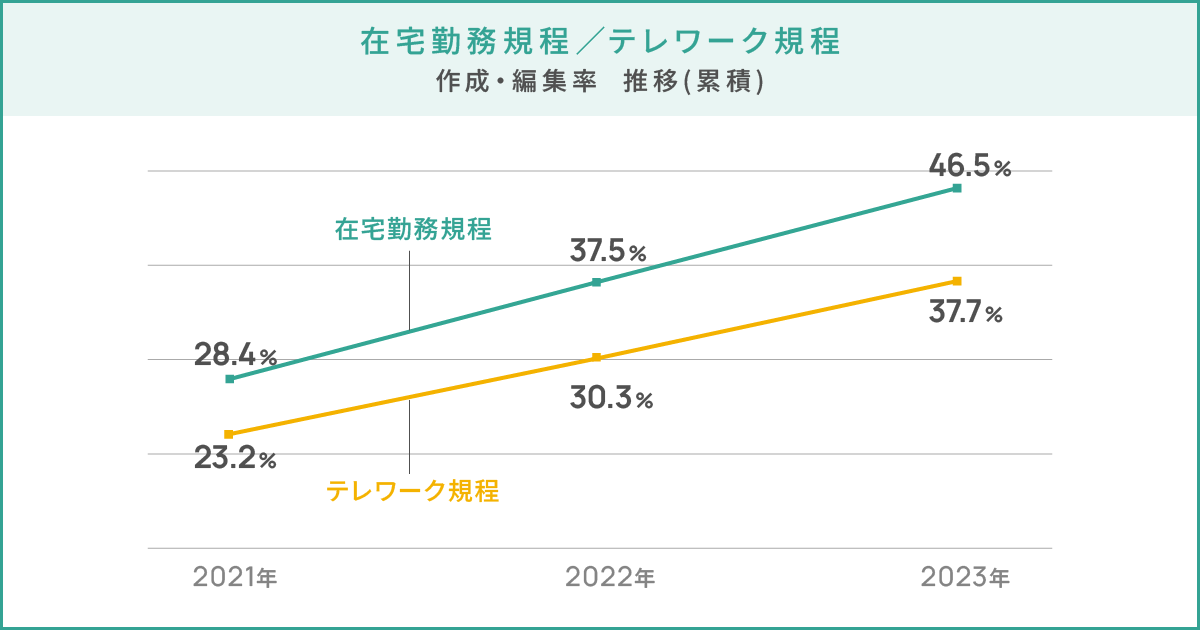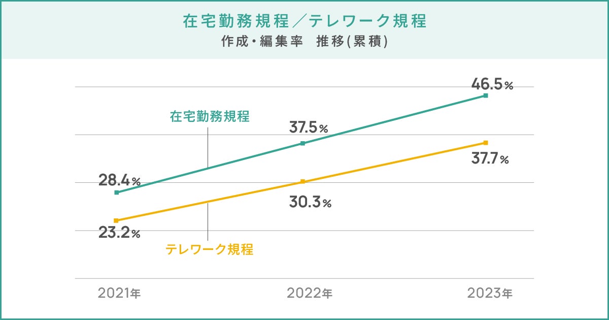 ③在宅勤務規程、テレワーク規程の作成・編集率は新型コロナが5類に移行した2023年も約1.2倍で増加傾向。