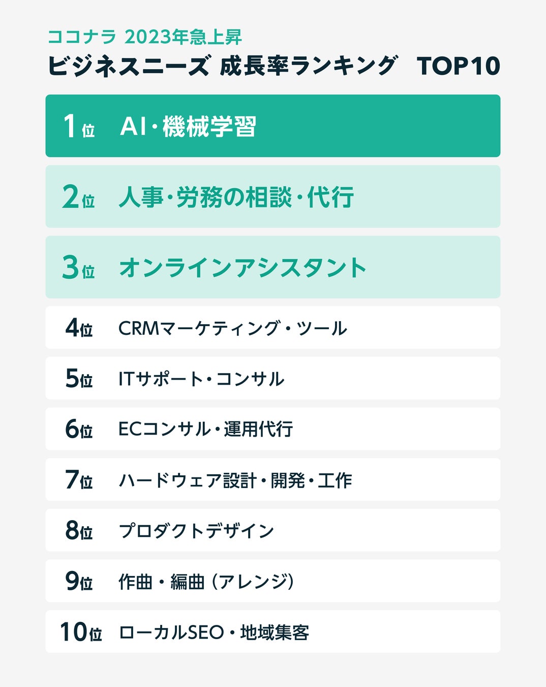 日本最大級のスキルマーケット「ココナラ」を運営する株式会社ココナラ(本社:東京都渋谷区、代表取締役社長CEO:鈴木 歩、以下ココナラ)は、23年度「ビジネスニーズ成長率ランキング」を発表いたします。
