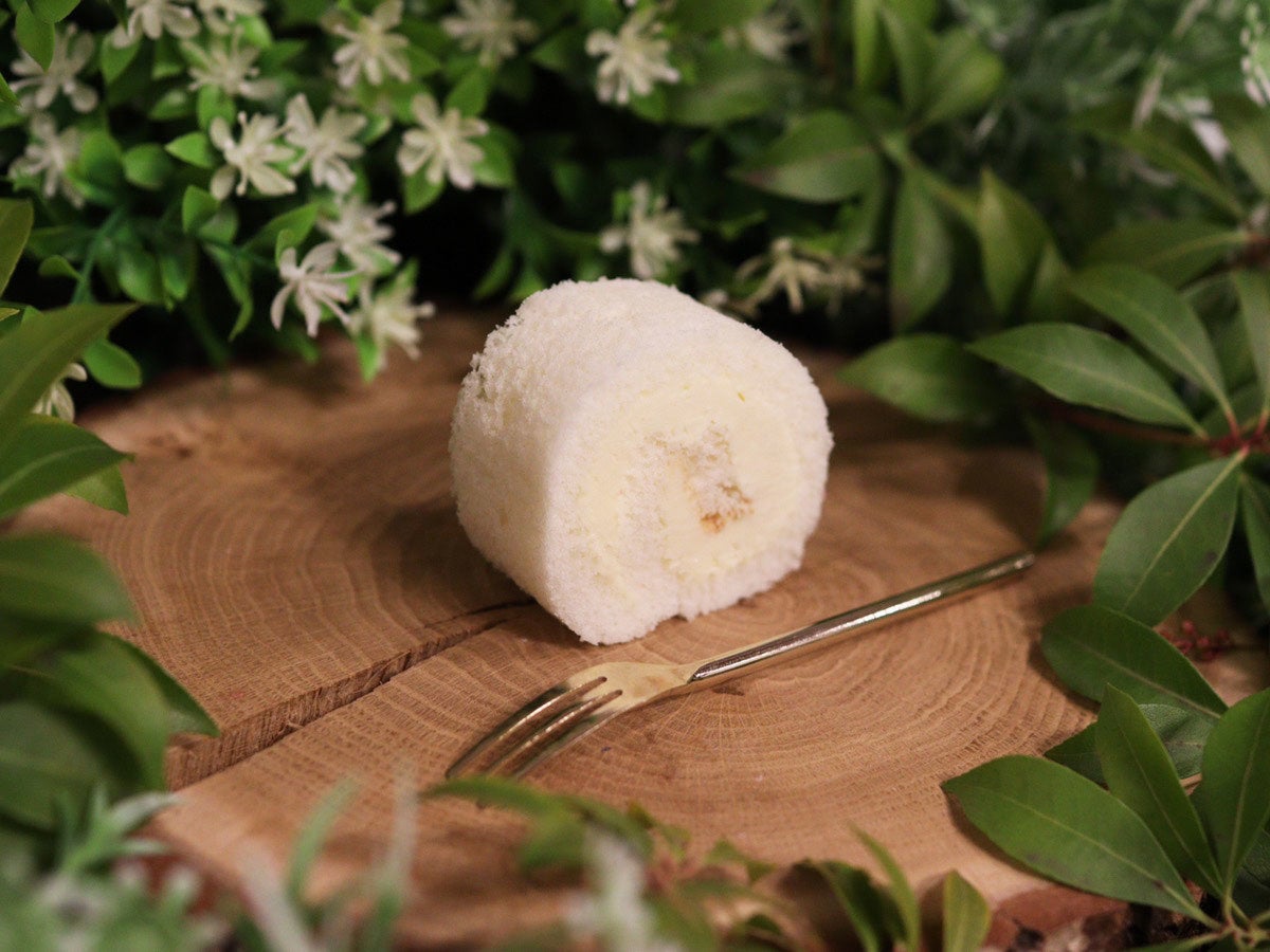 雪のように白一色にするためピュアホワイト卵を使ったチーズ好きにはたまらないミニロールケーキ