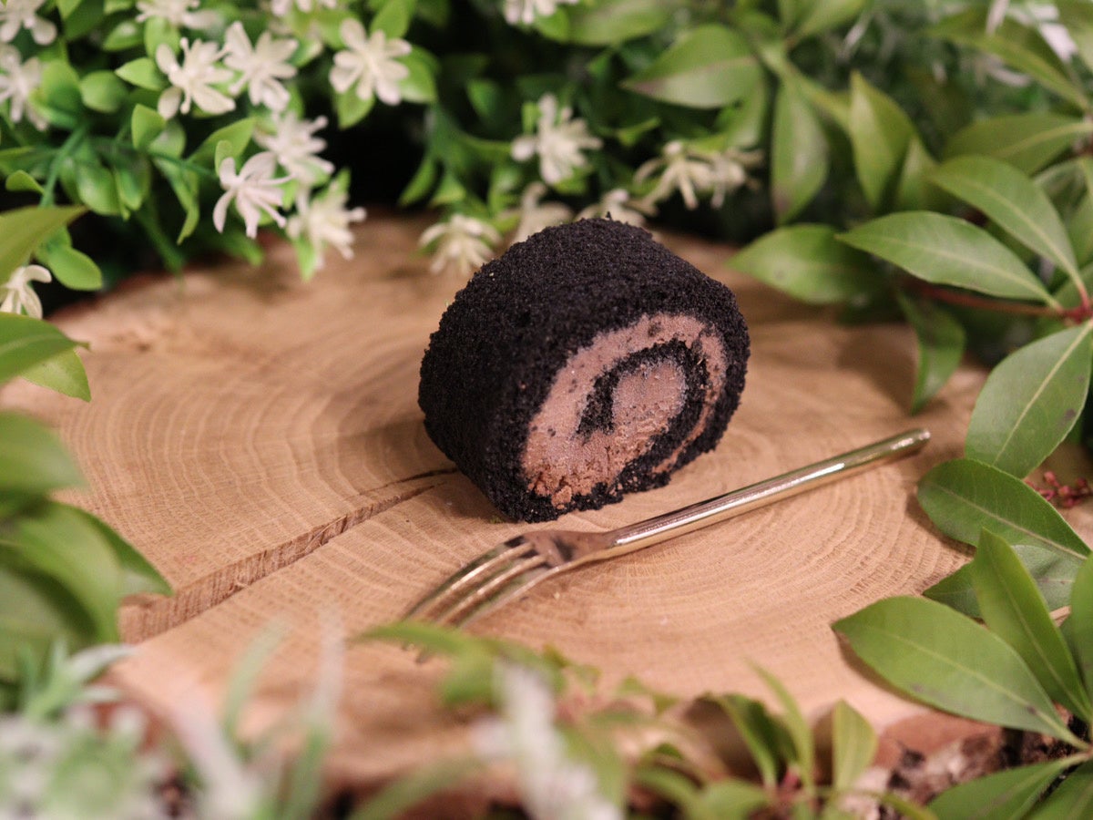 チョコで甘くなりすぎないように竹炭をスポンジに練り込み、純生チョコクリームとチーズを混ぜた禁断のチョコ×チーズ味のミニロールケーキ