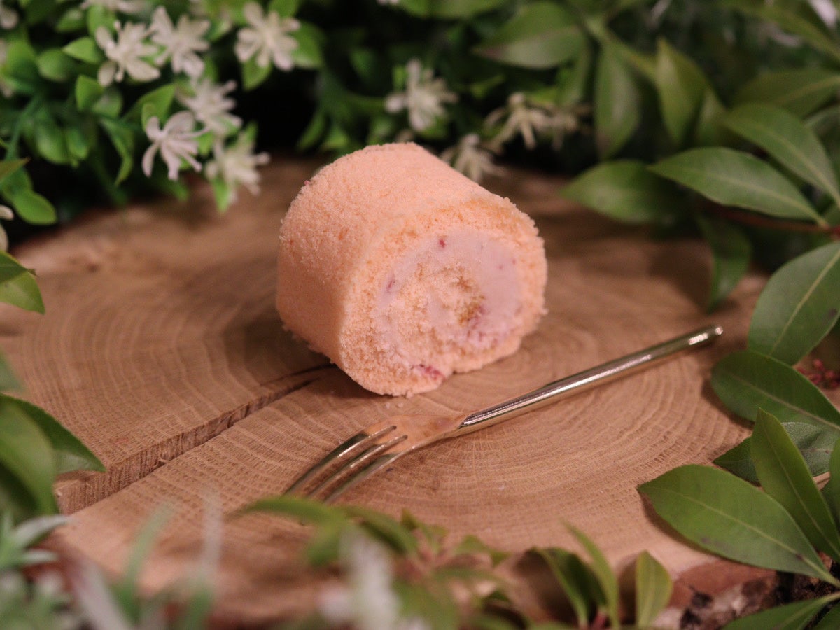 ラズベリー濃縮果汁を北海道産の卵で作るスポンジに混ぜ、さらに果肉入りの濃縮ラズベリーを純生クリームチーズと調合したラズベリー×チーズ味のミニロールケーキ