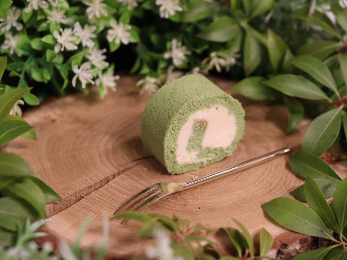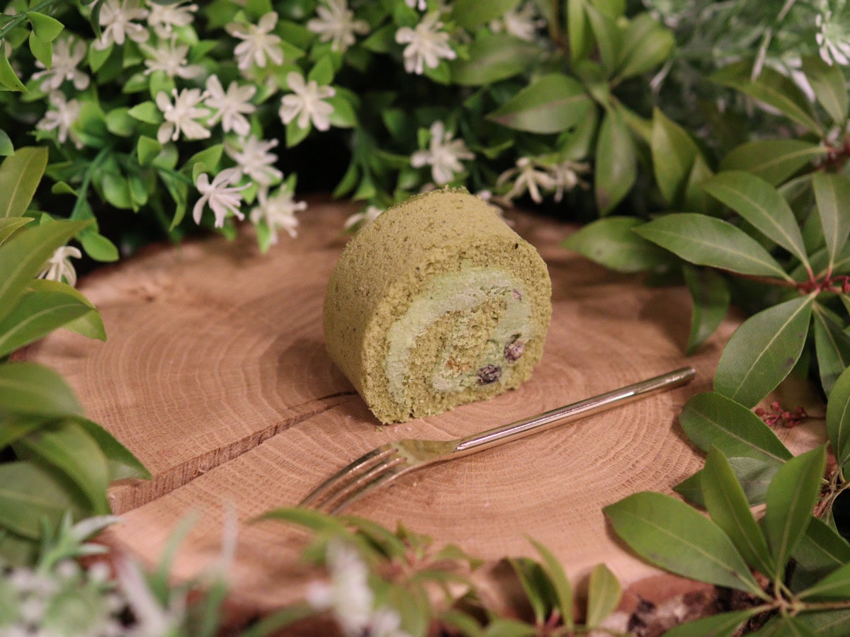 抹茶を練り込んだスポンジに、さらに北海道純生クリームとチーズに抹茶と十勝産の小豆を混ぜた抹茶×チーズ味のミニロールケーキ